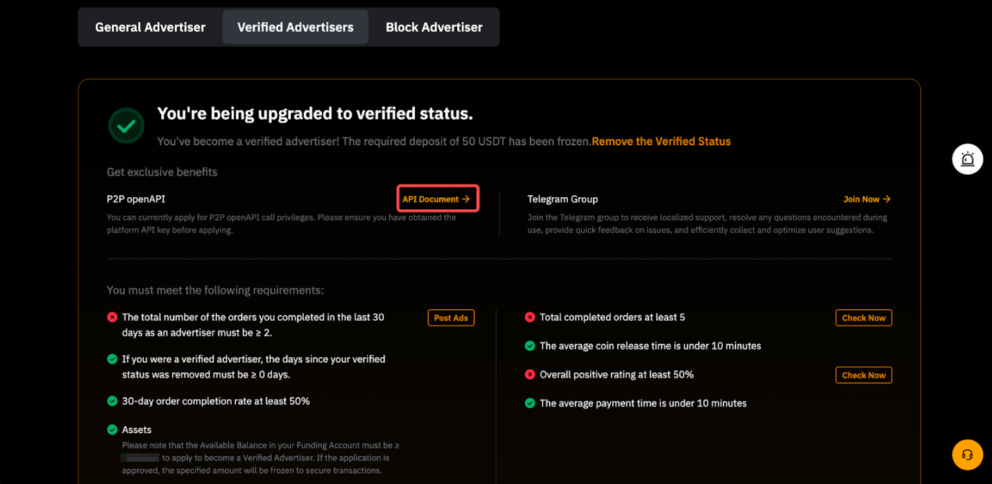 The P2P Open API integration enhances P2P services with full API support for the advertisers, empowering them to streamline their operations, automate key processes, and easily scale up transaction volume.
