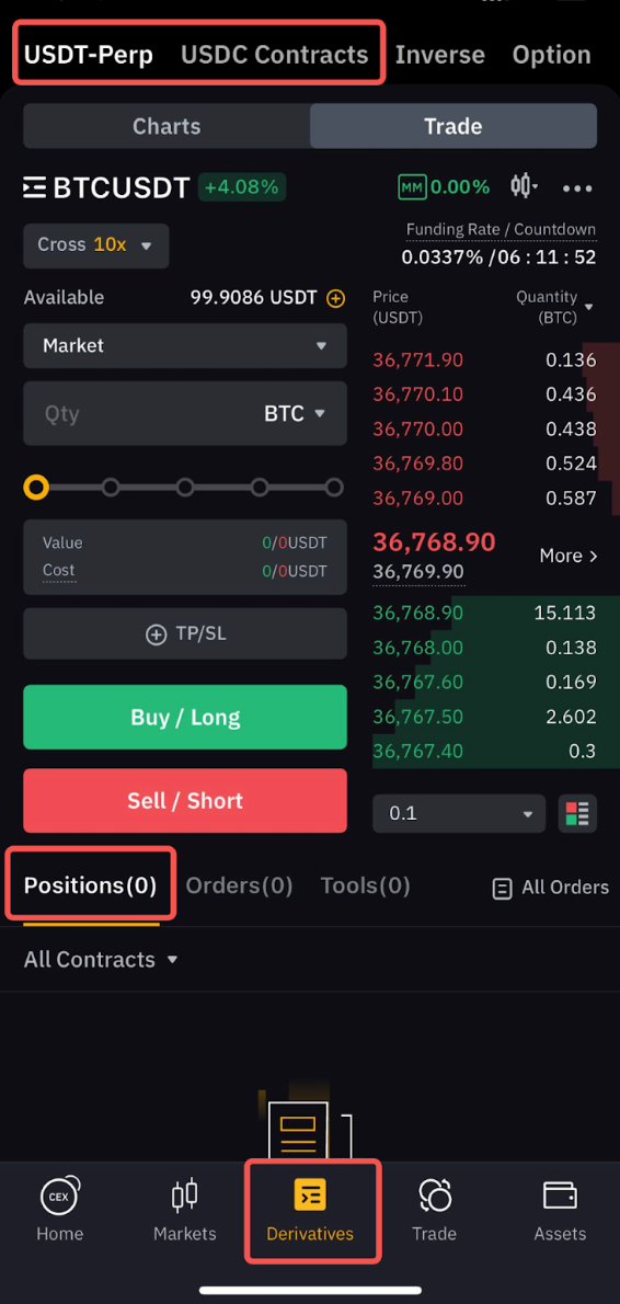 For Perpetual & Futures Positions, please tap Positions on the Derivatives Trading page. You may go to the Asset list on Spot Trading to view your Spot assets and check your Funding Income from the Transaction Log.