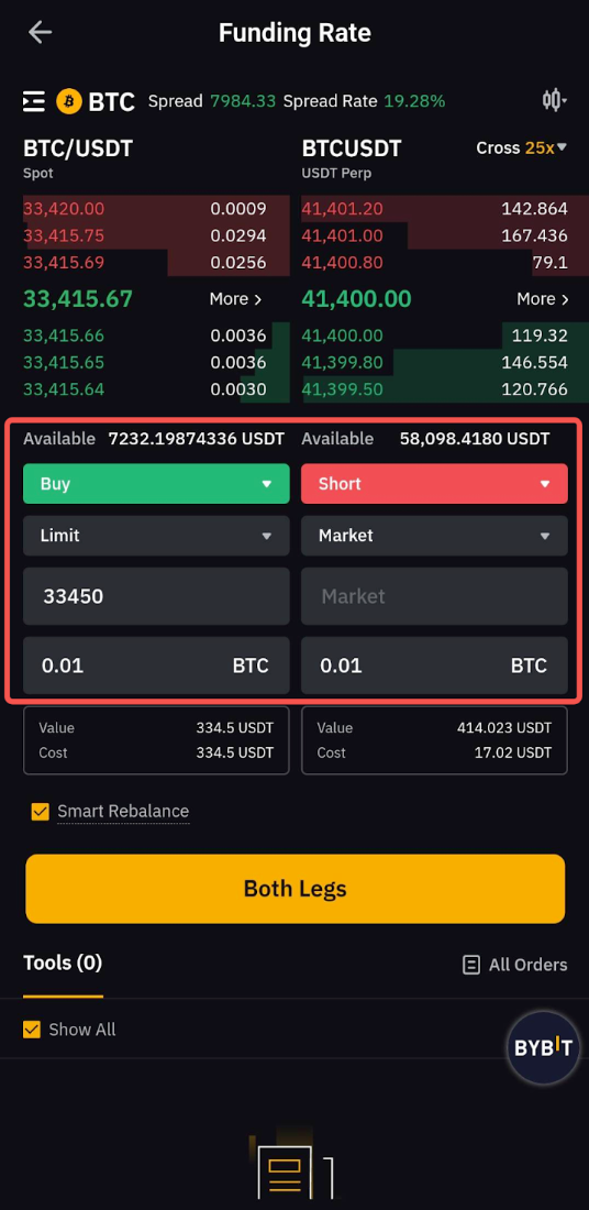 Bybit Arbitrage is a trading tool designed to help traders seize short-term opportunities emerging from price disparity in different markets. With Bybit Arbitrage, traders can monitor the order book and liquidity of two trading pairs or contracts concurrently, and place both-leg orders through a streamlined process that ensures greater precision in order fulfillment.