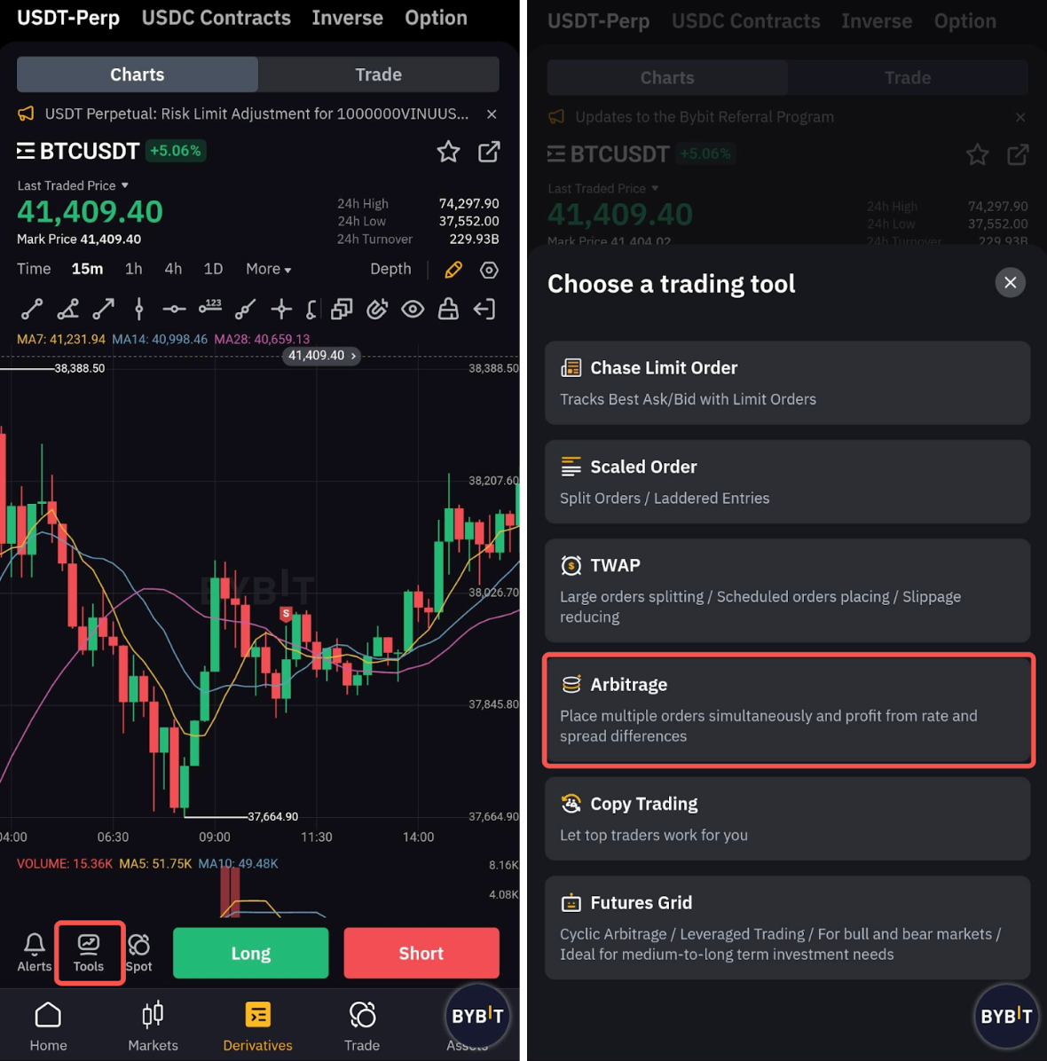 Step 1: Head to the trading page, tap Tools and select Arbitrage.