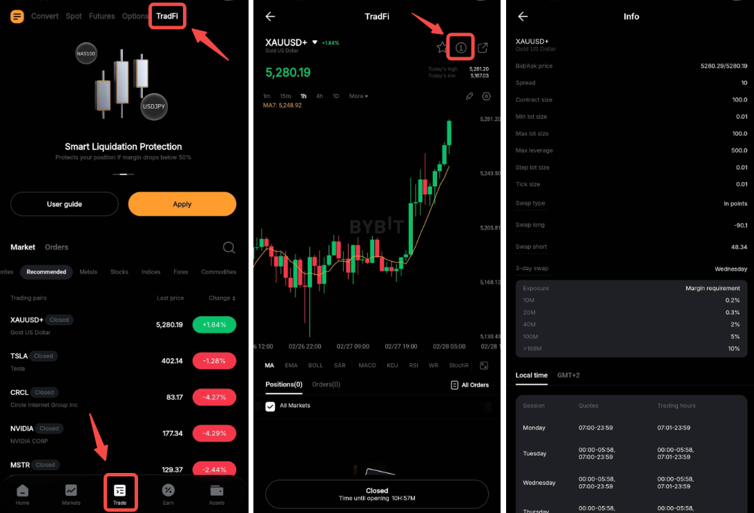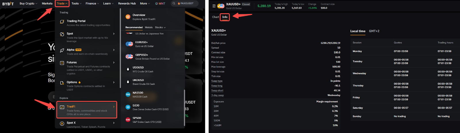 Go to Trade → TradFi and select the contract of your choice. On the Contract page, click on Info to see all of the necessary information for that specific trading pair.