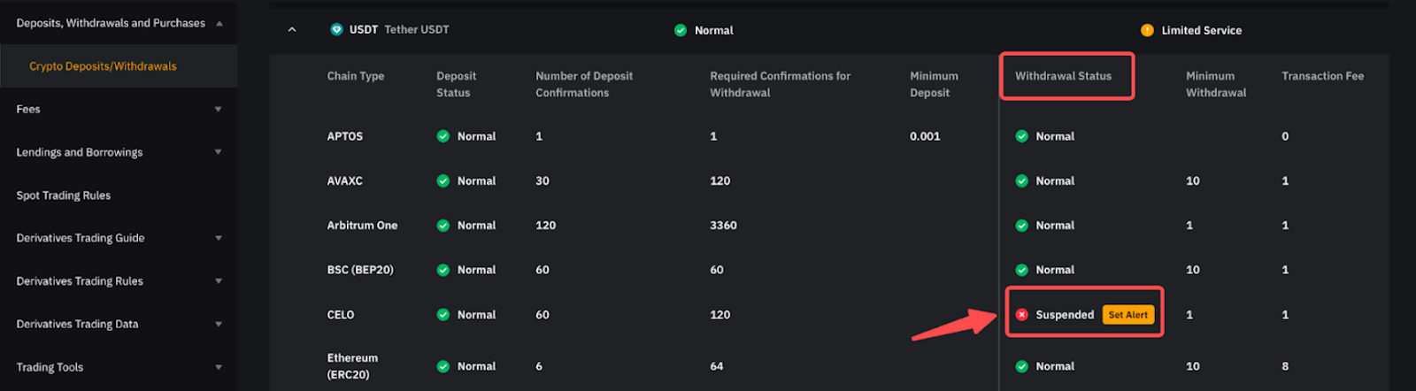 Alternatively, you can go to the Deposit/Withdrawal status page and search for the token and chain. The Set Alert button will be visible next to the Suspended deposit status.