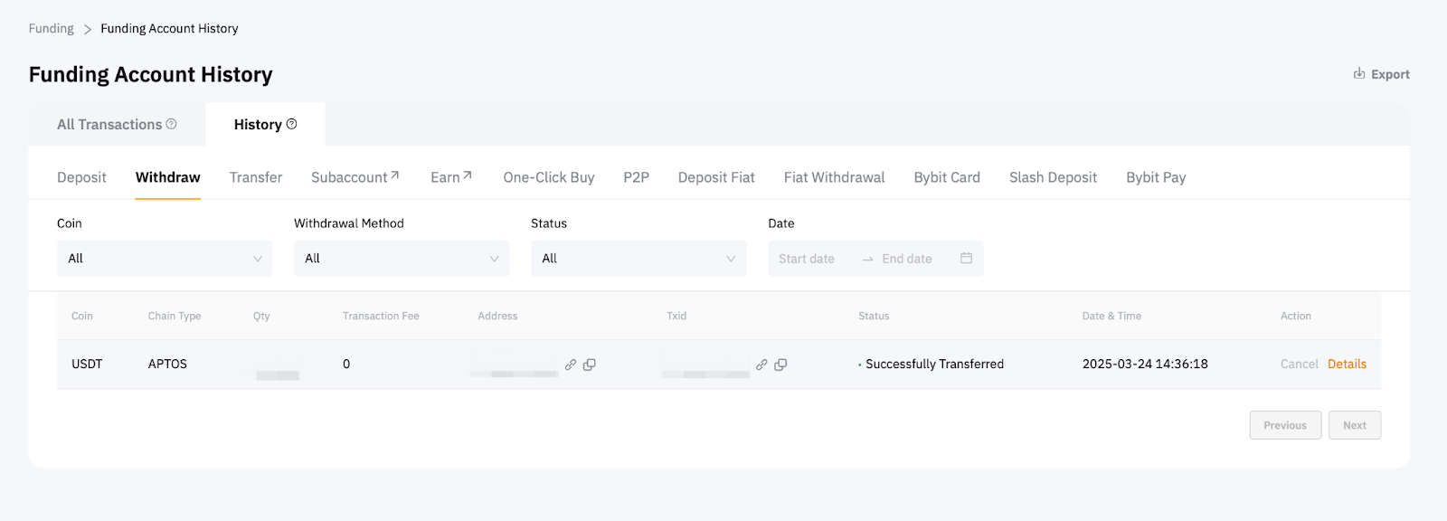 Please note that actions considered as withdrawals include Crypto On-Chain Withdrawal, Internal Transfer, Fiat Withdrawal, Bybit Card transactions and P2P Trading (both buy or sell orders). For more information, please refer to Common Reasons for Unsuccessful Withdrawal Request Submissions.