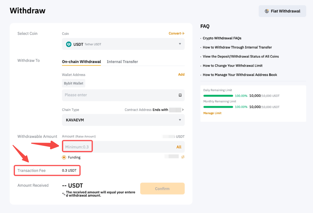 Bybit charges a fixed fee for all withdrawals and dynamically adjusts the batch transfer miner fee to a higher level to ensure faster confirmation speeds of withdrawals on the blockchain.
