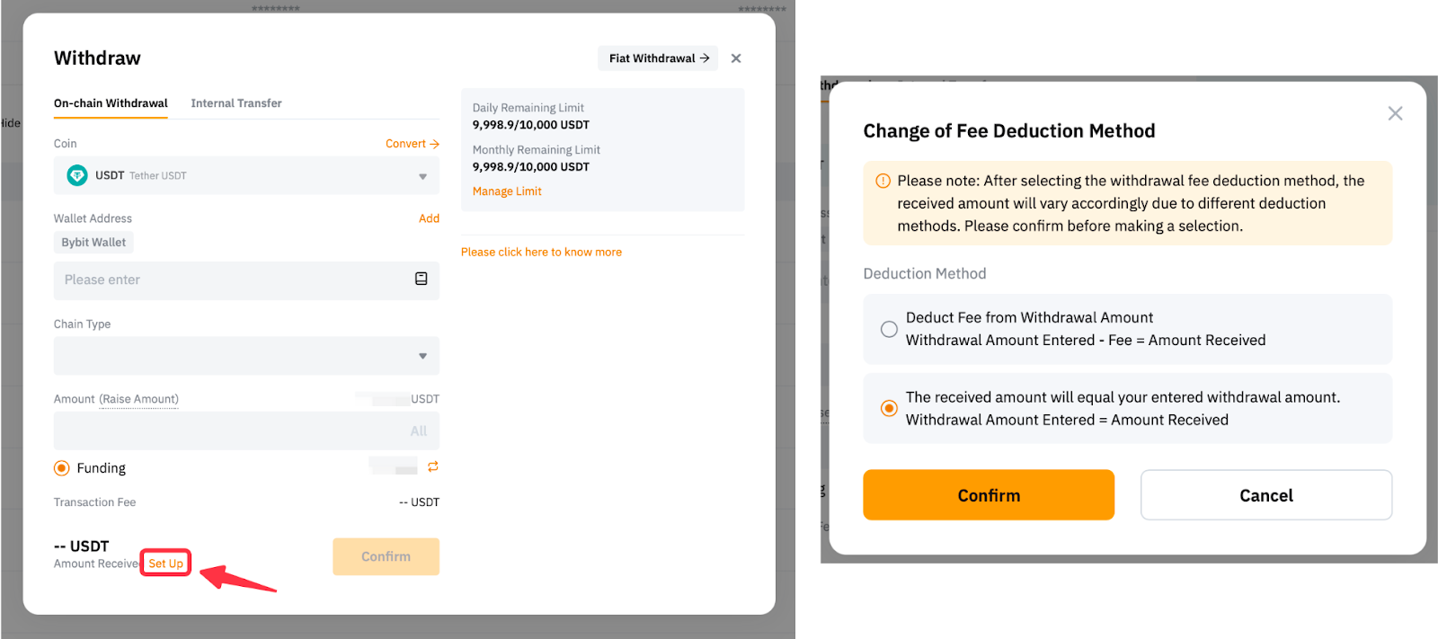 By default, the withdrawal fee will be deducted from the indicated withdrawal amount. However, it is possible to modify this setting by clicking on Set Up and selecting the preferred deduction method.