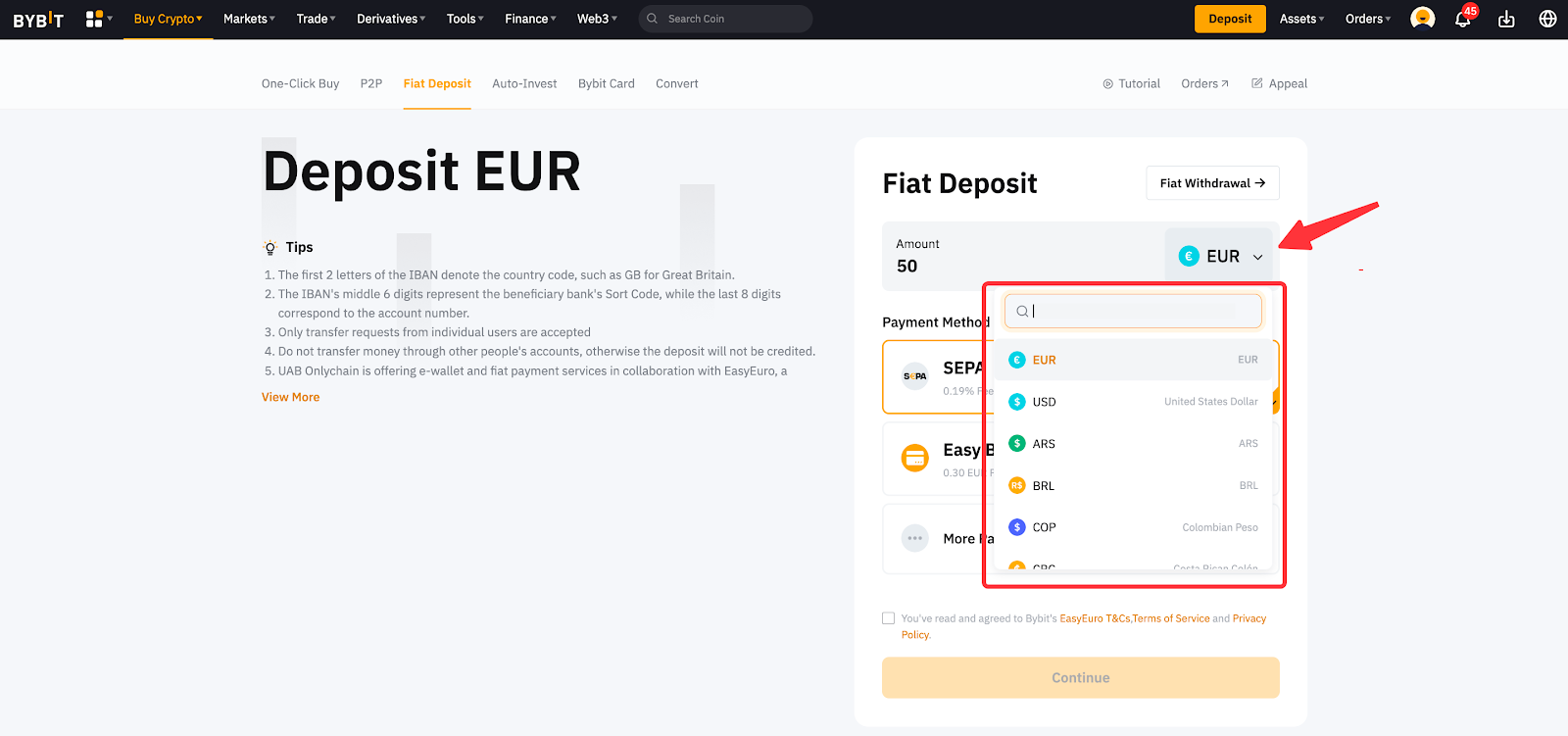 You can find the list of supported currencies for fiat deposit by going to the Fiat deposit page and opening the currency menu shown below: