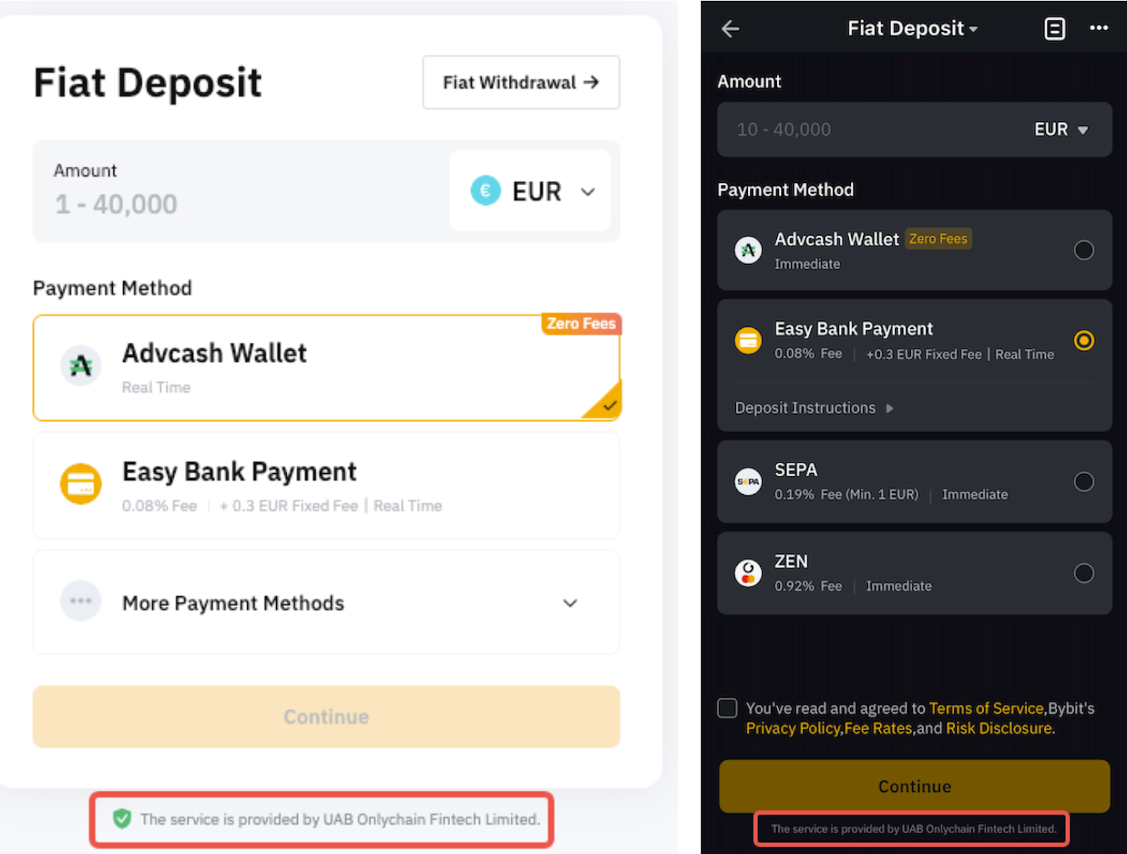 Fiat Deposit allows you to transfer fiat currency to your Bybit Funding Account. After that, you can purchase coins at any time with the fiat balance in your Funding Account. To learn more about other payment methods, please visit here.