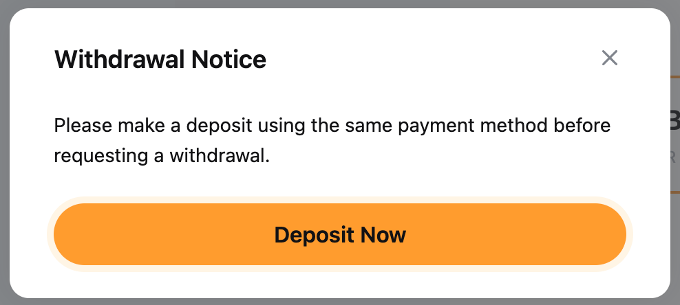 — For certain currencies and payment methods, you can only withdraw funds to an account you have already used to deposit using the same method and currency. If it is a new account, make a successful deposit first before attempting a withdrawal. Please make sure to check the requirements for each payment method before making a fiat withdrawal.
