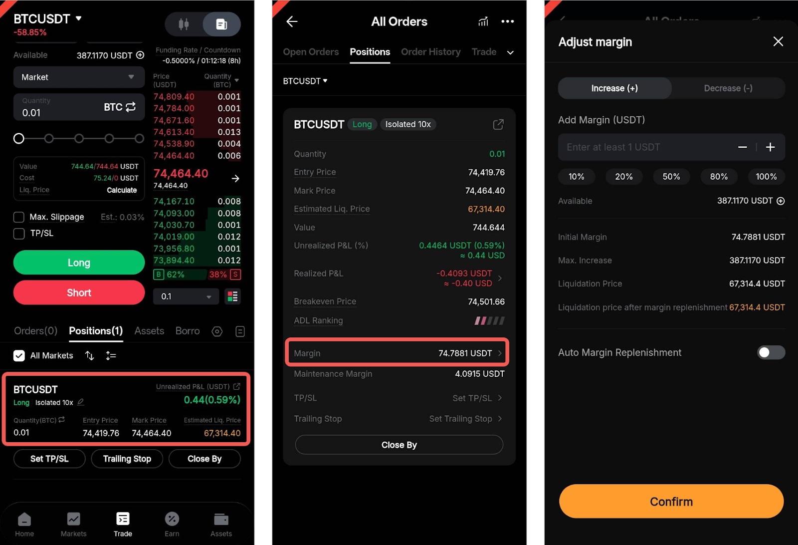 Auto-Margin Replenishment (AMR) is a feature available only under Isolated Margin mode. When AMR is triggered, the system automatically adds margin to a position using the available account balance to help reduce liquidation risk. You will also receive notifications, allowing you time to better manage your positions.