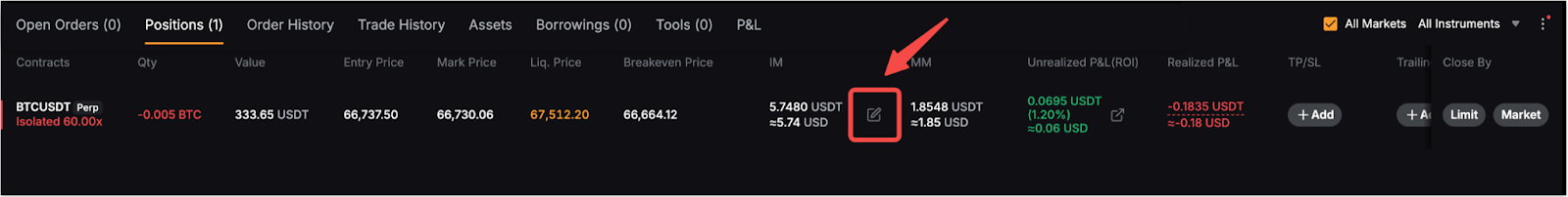On the website, go to the Positions tab at the bottom of the trading page, then click the edit icon next to IM.