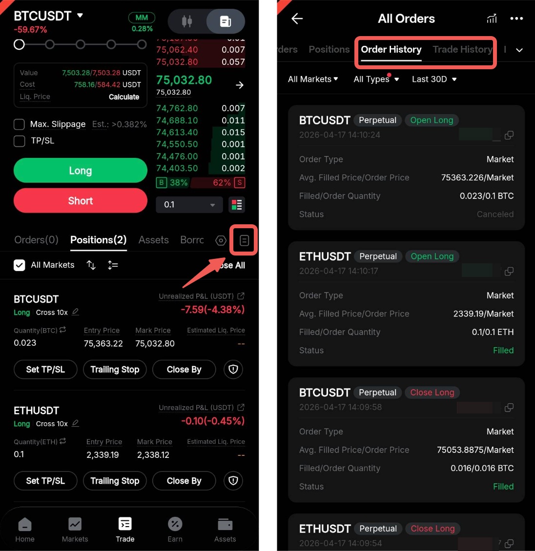 On the Bybit App, tap the history icon below the order book to access your Order History and Trade History.