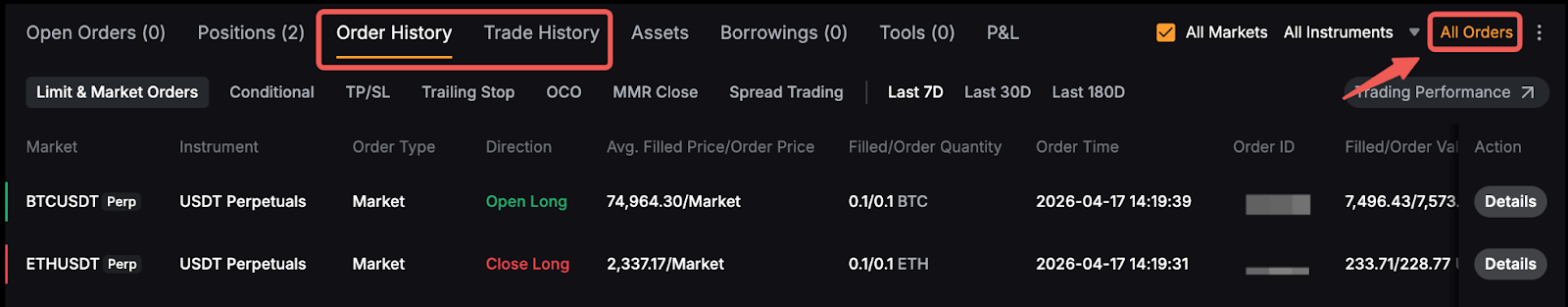 On the website, you can view your trading history in the Order History and Trade History sections below the trading chart. Click All Orders to view the complete records.