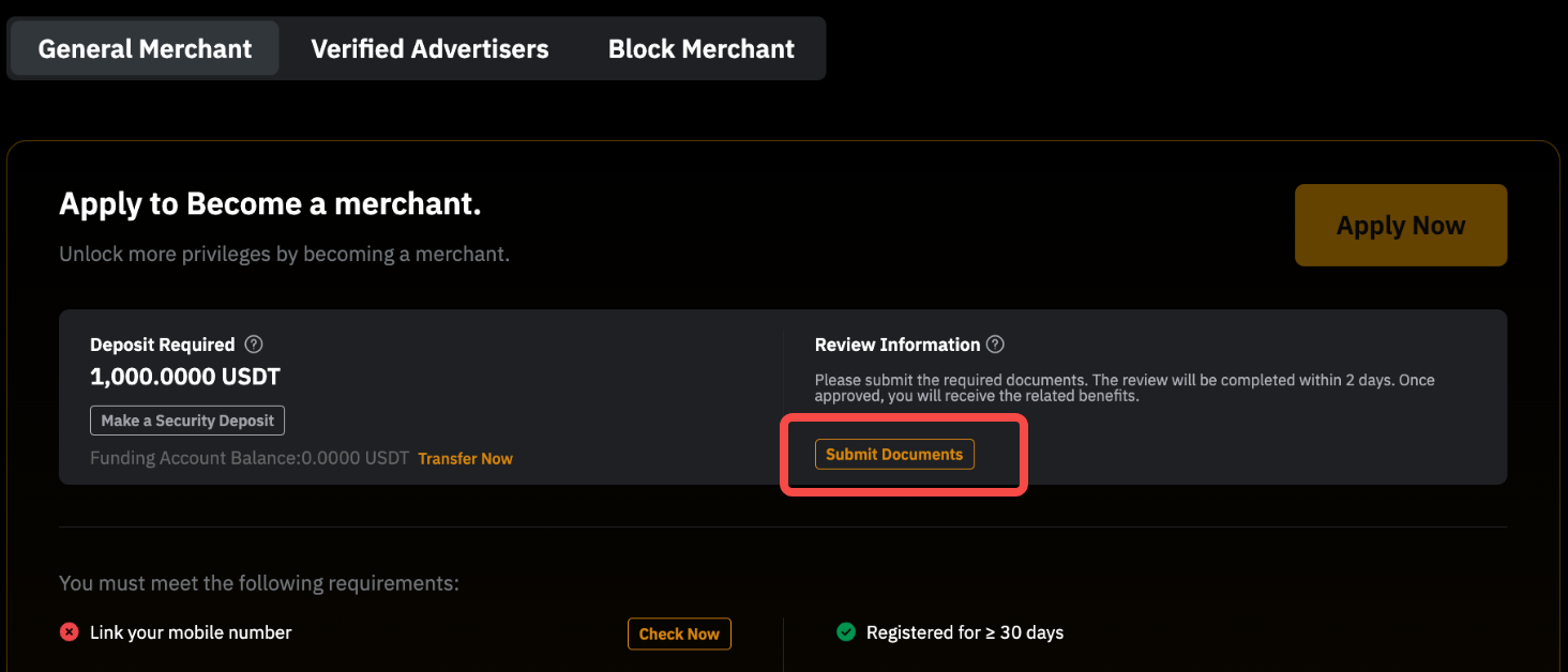 5. For a General Advertiser, the required security deposit is 200 USDT. For higher-level advertiser types (e.g., Verified Advertiser or Block Advertiser), the necessary deposit is 1,000 USDT.