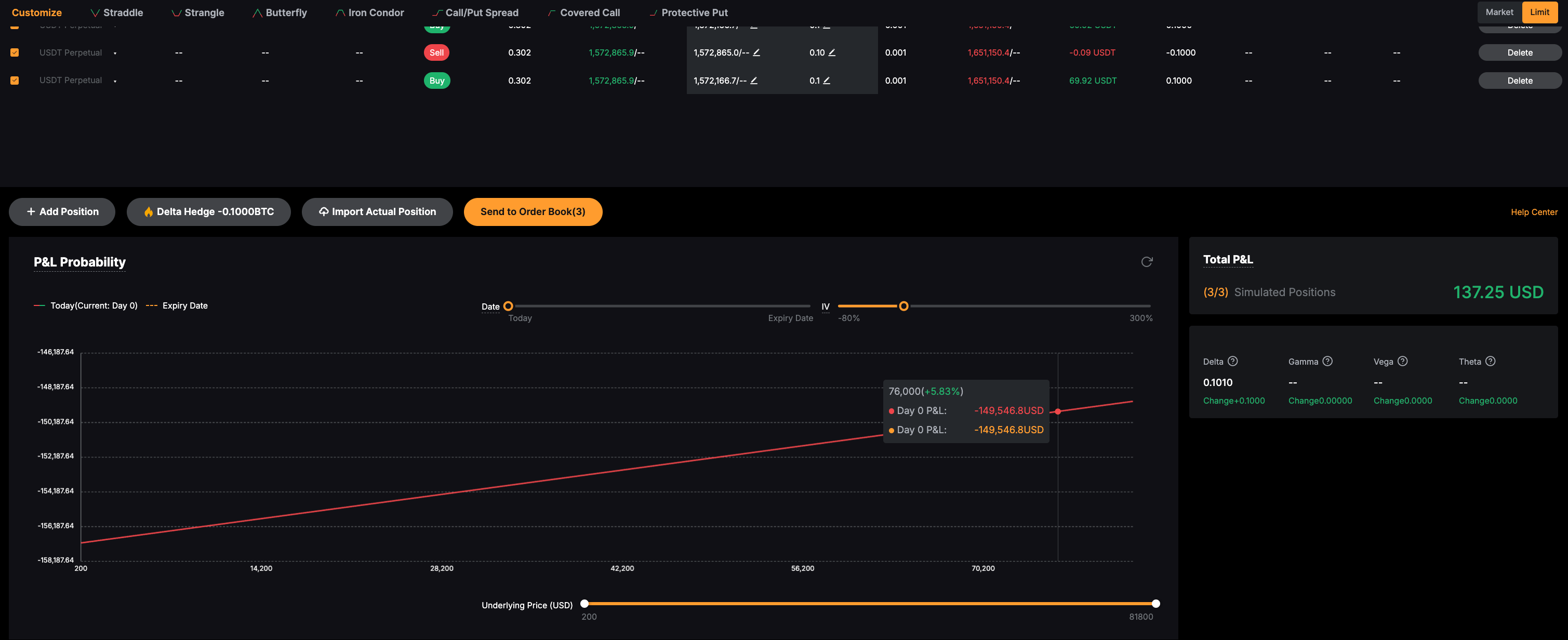 With USDT Perpetuals, USDC Perpetuals, USDC Futures and USDC Options contracts, you can customize up to 200 positions. Plus, discover the possibilities of Straddle Strategies, Butterfly Strategies, Iron Condor Strategies, Strangle Strategies, Call/Put Spread Strategies, Covered Call Strategies and Protective Put Strategies for a variety of investment ideas in different market situations.