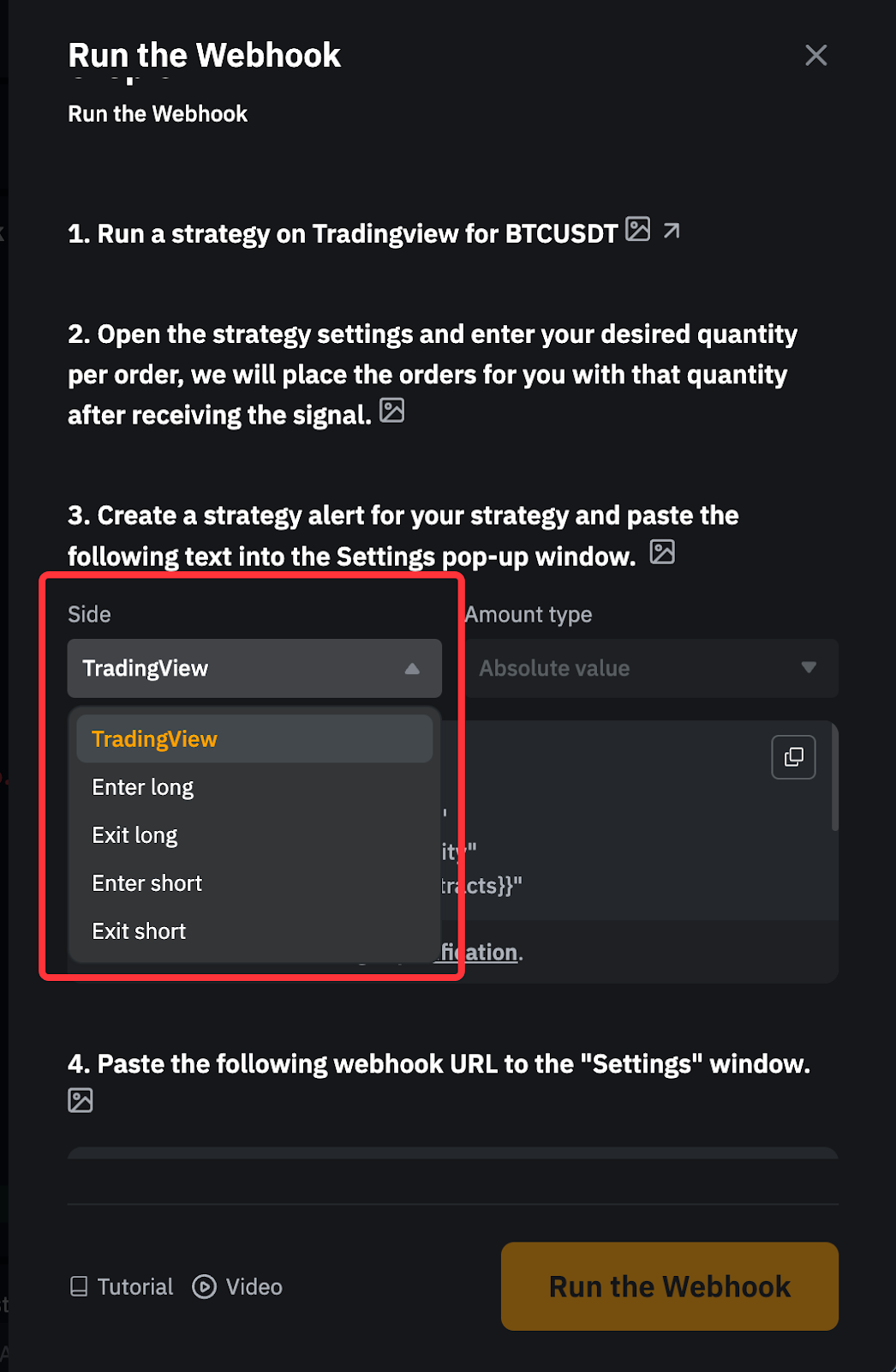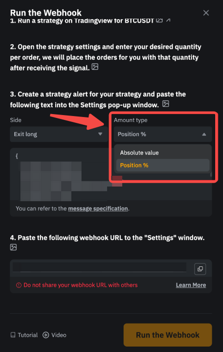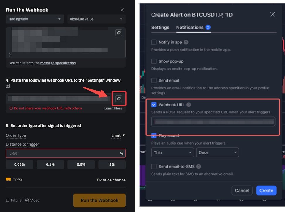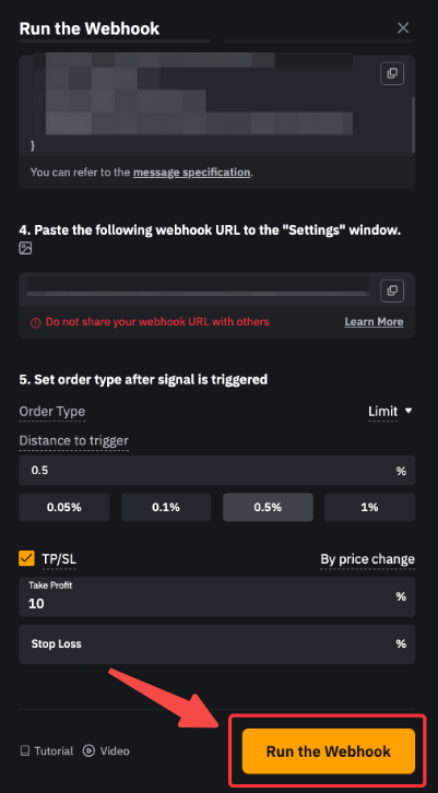 — The Webhook URL will be found in the Bybit page and should be pasted to the Webhook URL field in the alert notification tab.