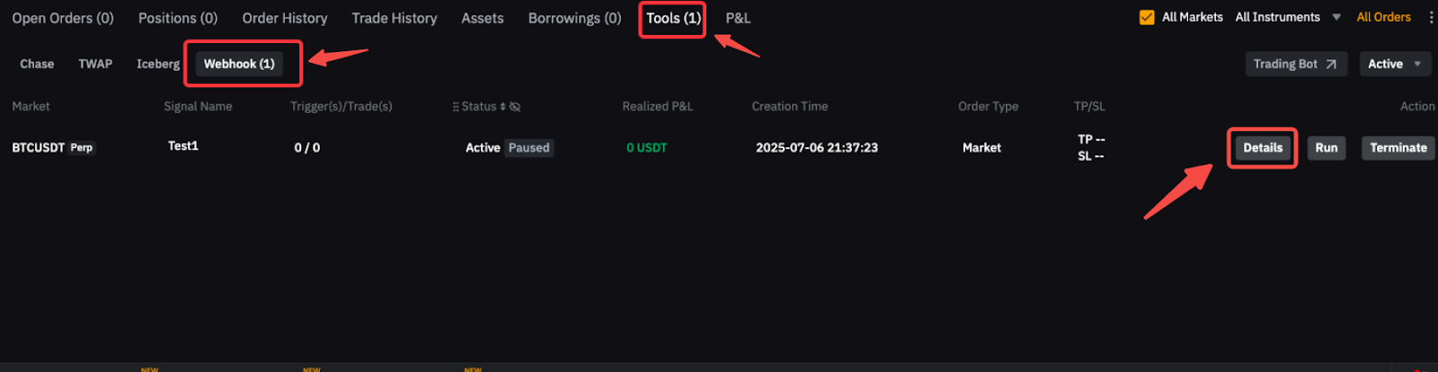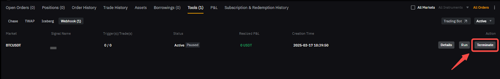 Manual Termination or Pause: To manually terminate a webhook signal, navigate to the Tools Tab. Find the signal initiated by the webhook you wish to close and click on Terminate. If you want to temporarily stop the strategy, click on Pause instead.