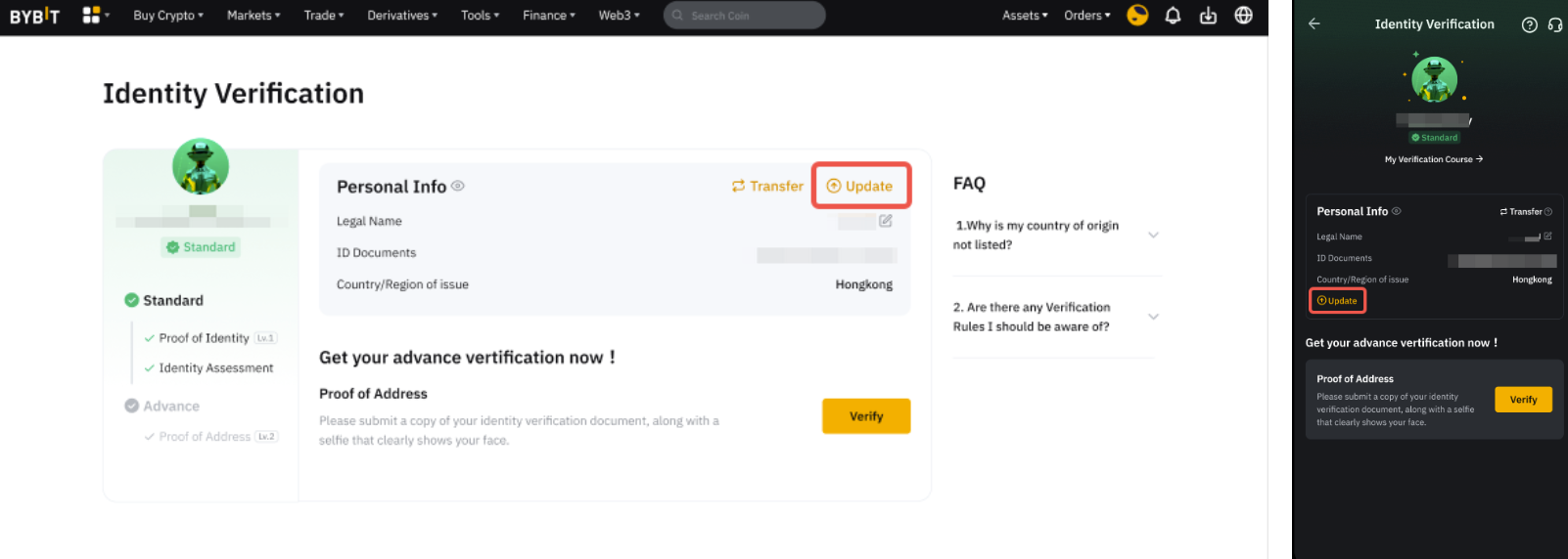 Identity Verification of at least Standard level is mandatory for all Bybit products and services. Depending on the requirements for different regions, products, or services, you may be required to complete a higher level of verification. For more information, please refer to the benefits of different KYC levels.