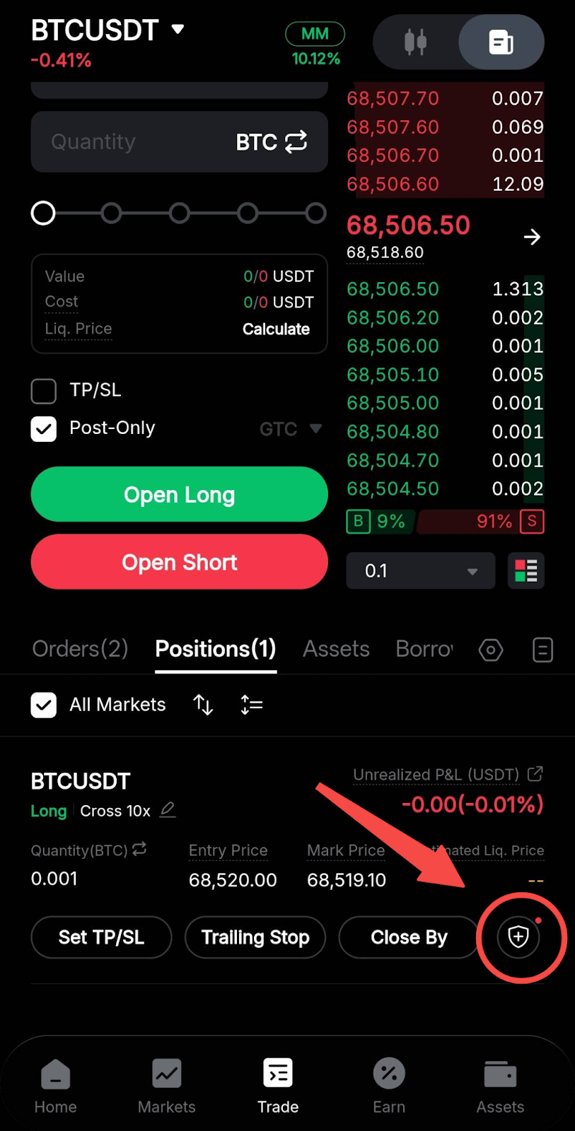 Step 1: Go to the Positions tab and tap the shield icon under an active Perpetual Contract to access Perp Protect.