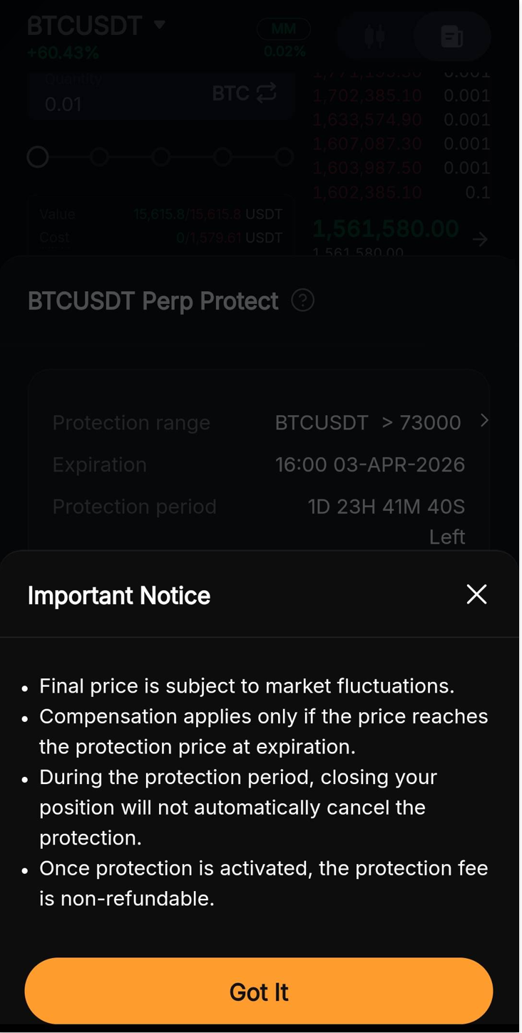 5. Perp Protect is not a risk-free product. The liquidation process for your Perpetual positions will still follow standard procedures. Please ensure that you fully understand the product before purchasing.