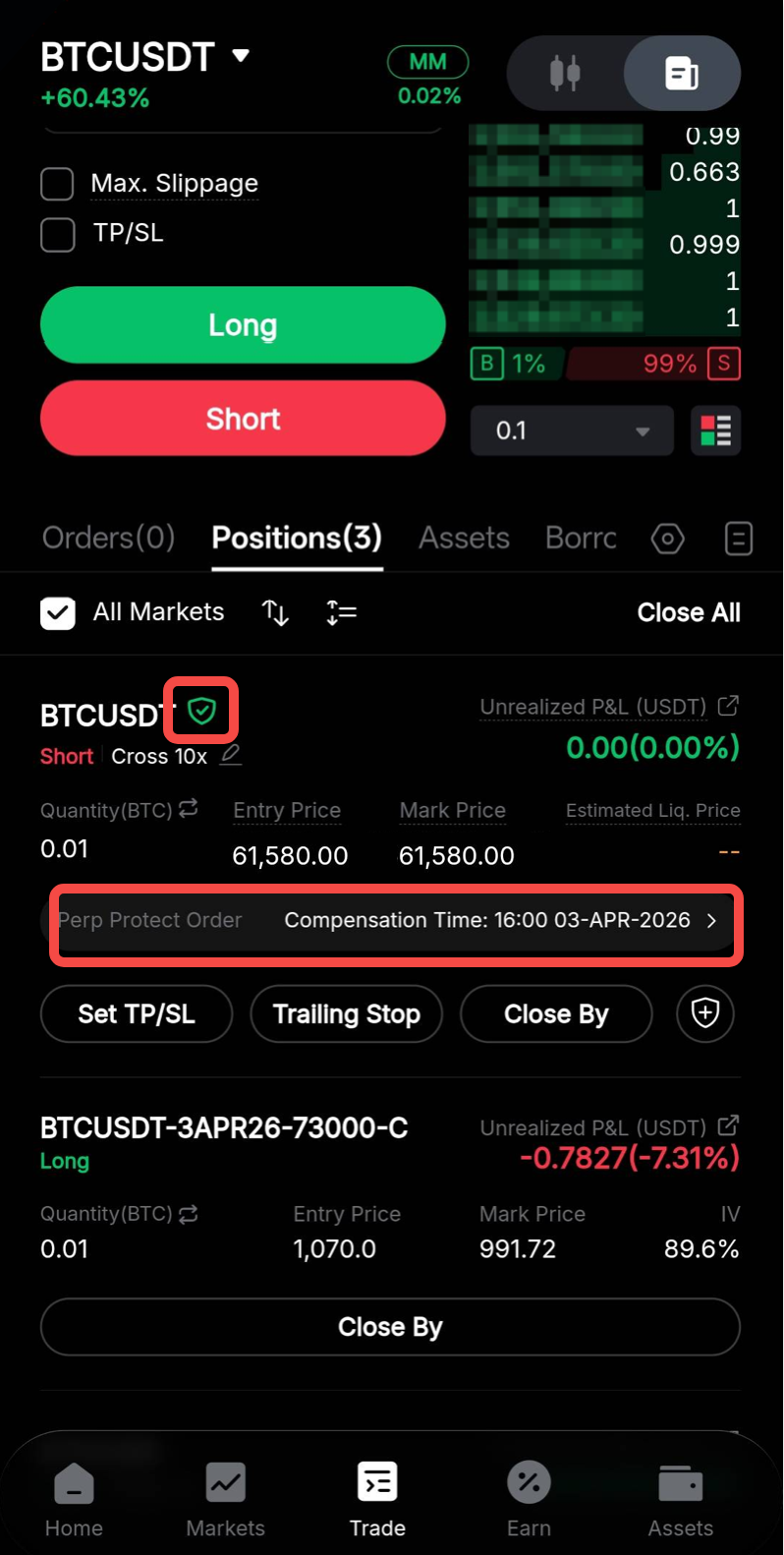 2. Trigger condition met: The Options will be exercised, and you will automatically receive compensation in your Unified Trading Account. This helps reduce overall losses when the market moves against your Perpetual position.