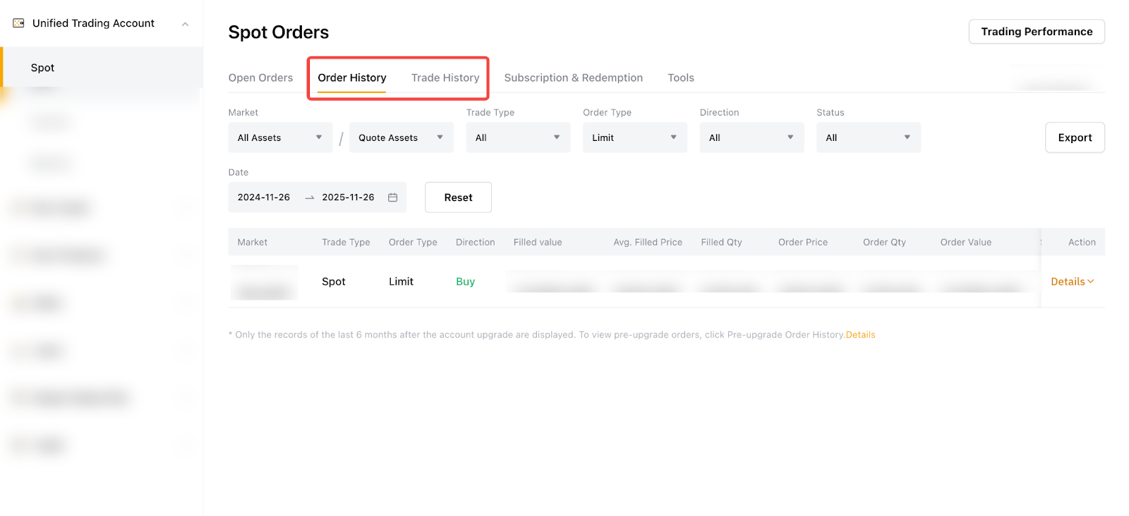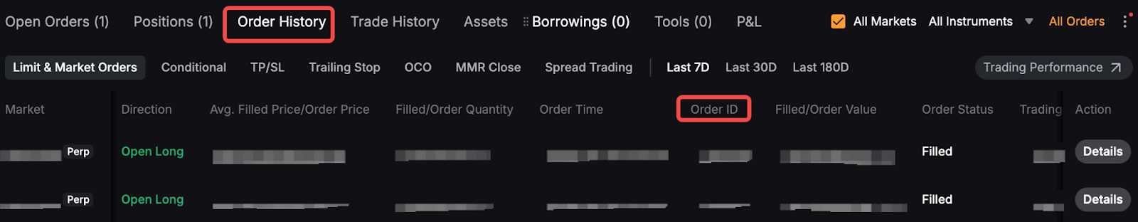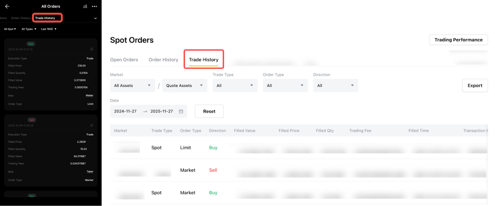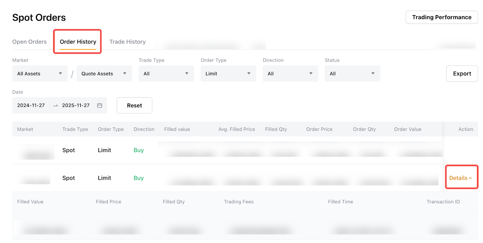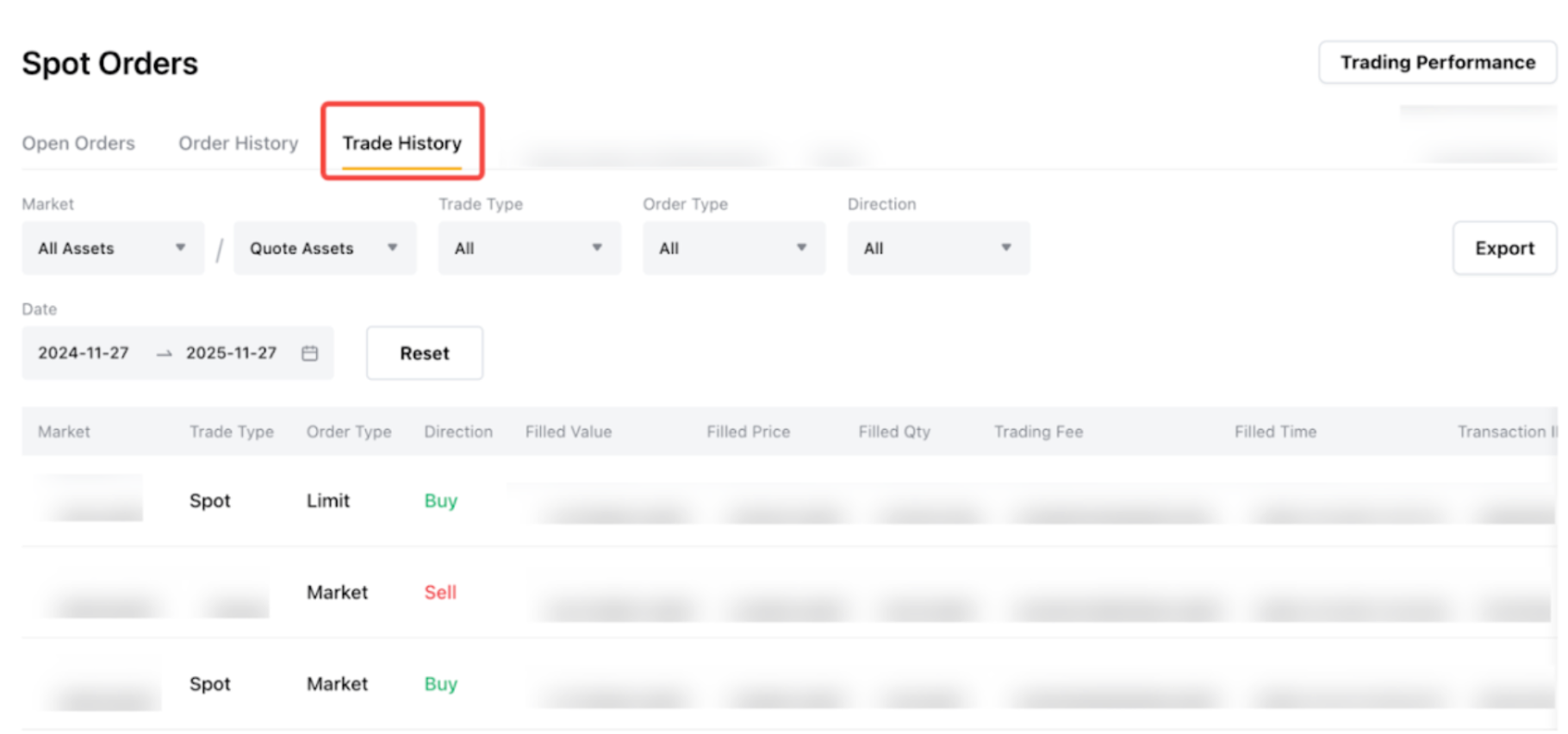 There, you will be able to filter the records by Market (All Assets & Quote Assets), Trade Type, Order Type, Direction or Status to locate the specific record you need quickly.
