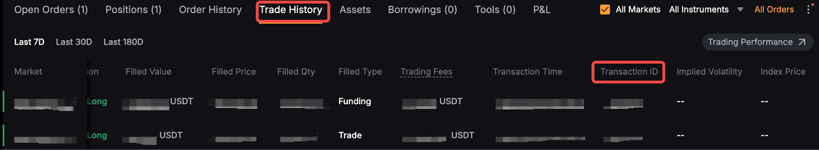6. Transaction ID: A unique identifier for the specific trade transaction. The Transaction ID can be also be found in the Trade History.