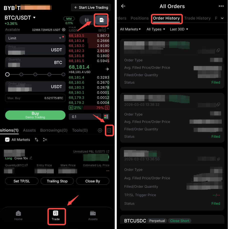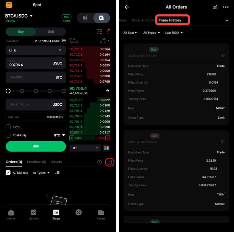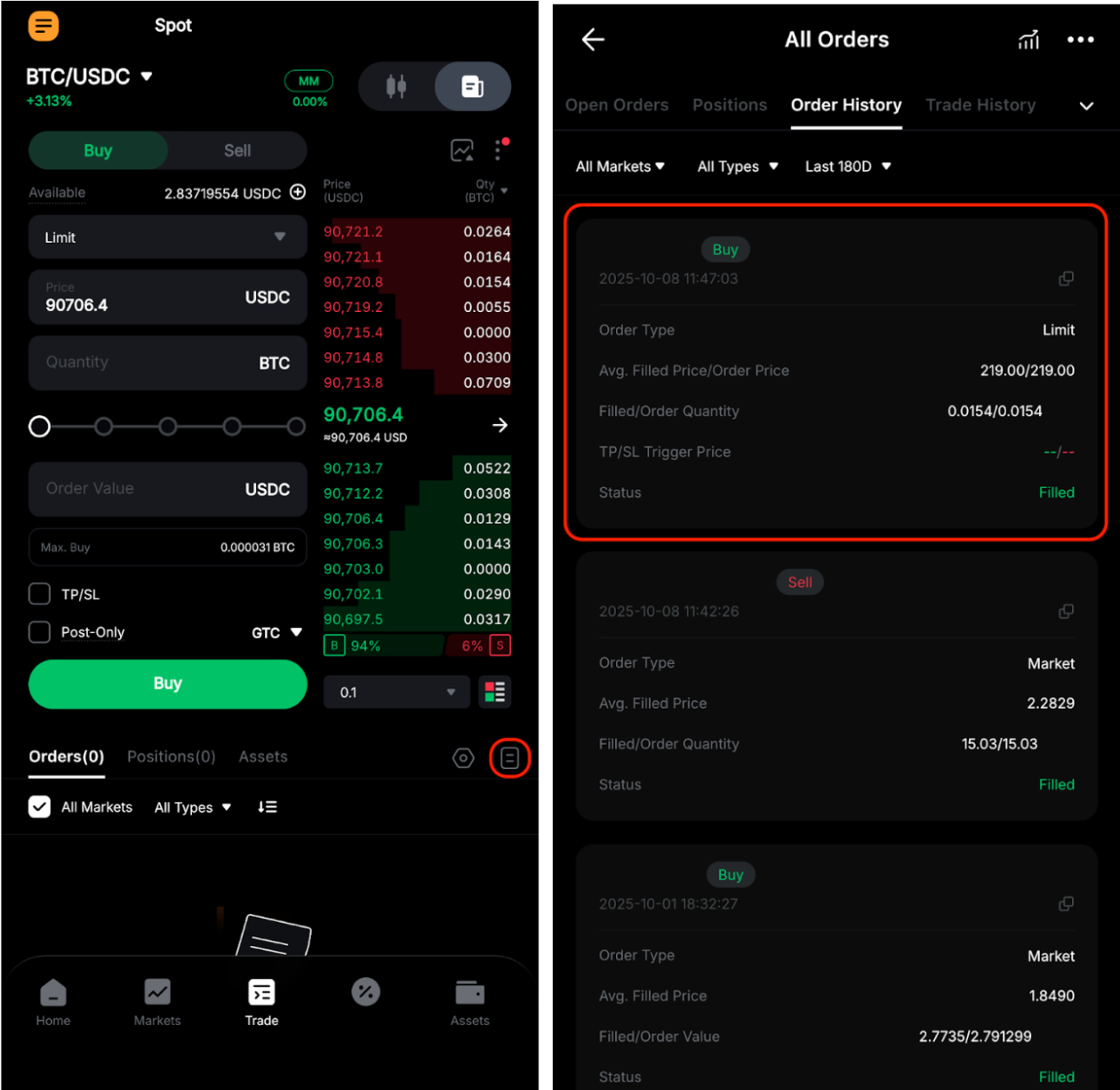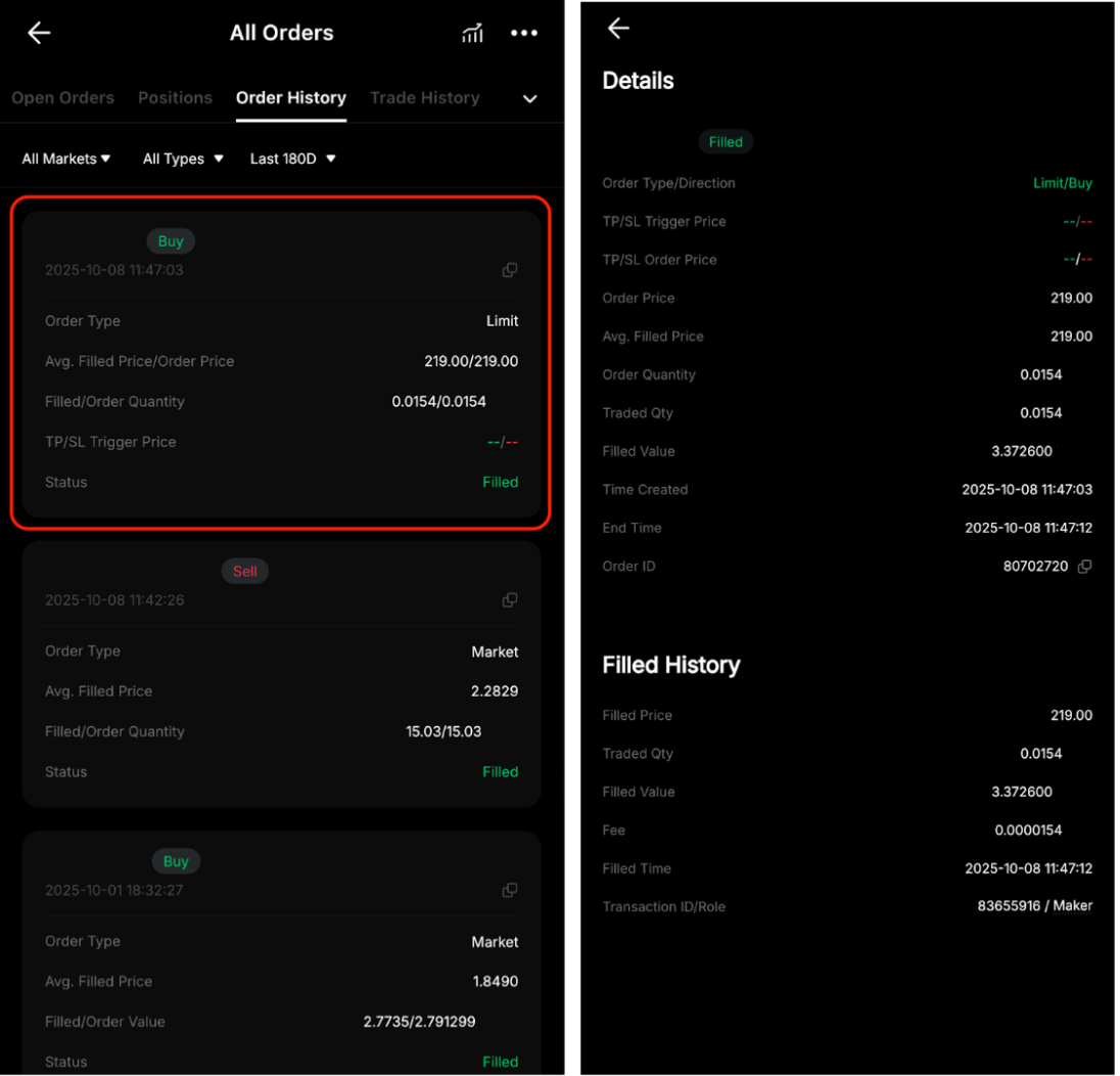 On the App: Go to the Trade page and tap on the History icon in the top right corner of the position box to view all your records. Then, select the Order History tab.