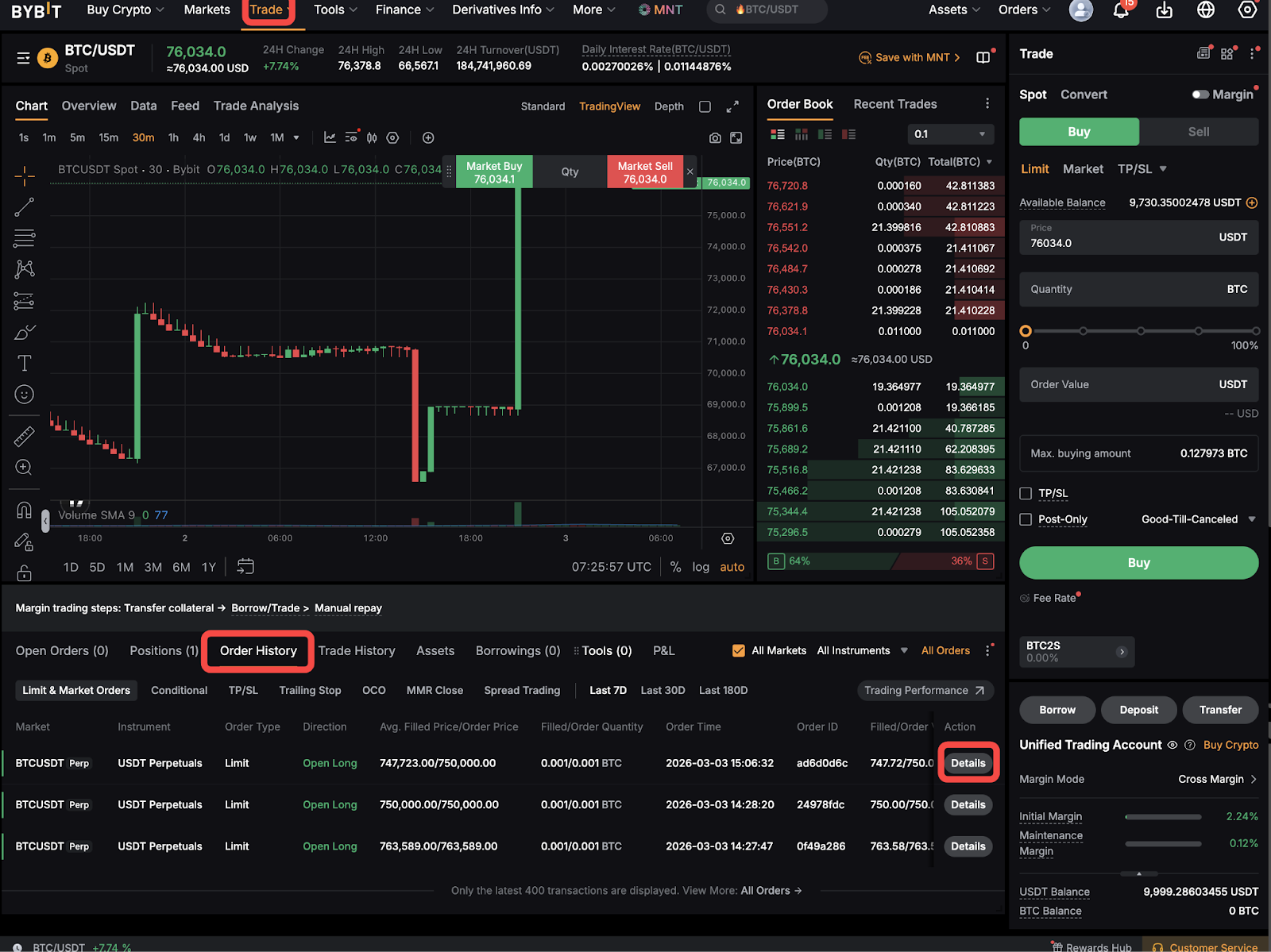 Bybit provides two types of records for your past trading activities: Trade History and Order History. These features allow you to clearly track all executed trades, cancelled orders, fees, and more. Whenever you place an order or execute a trade, you can easily find the corresponding record through these two sections.