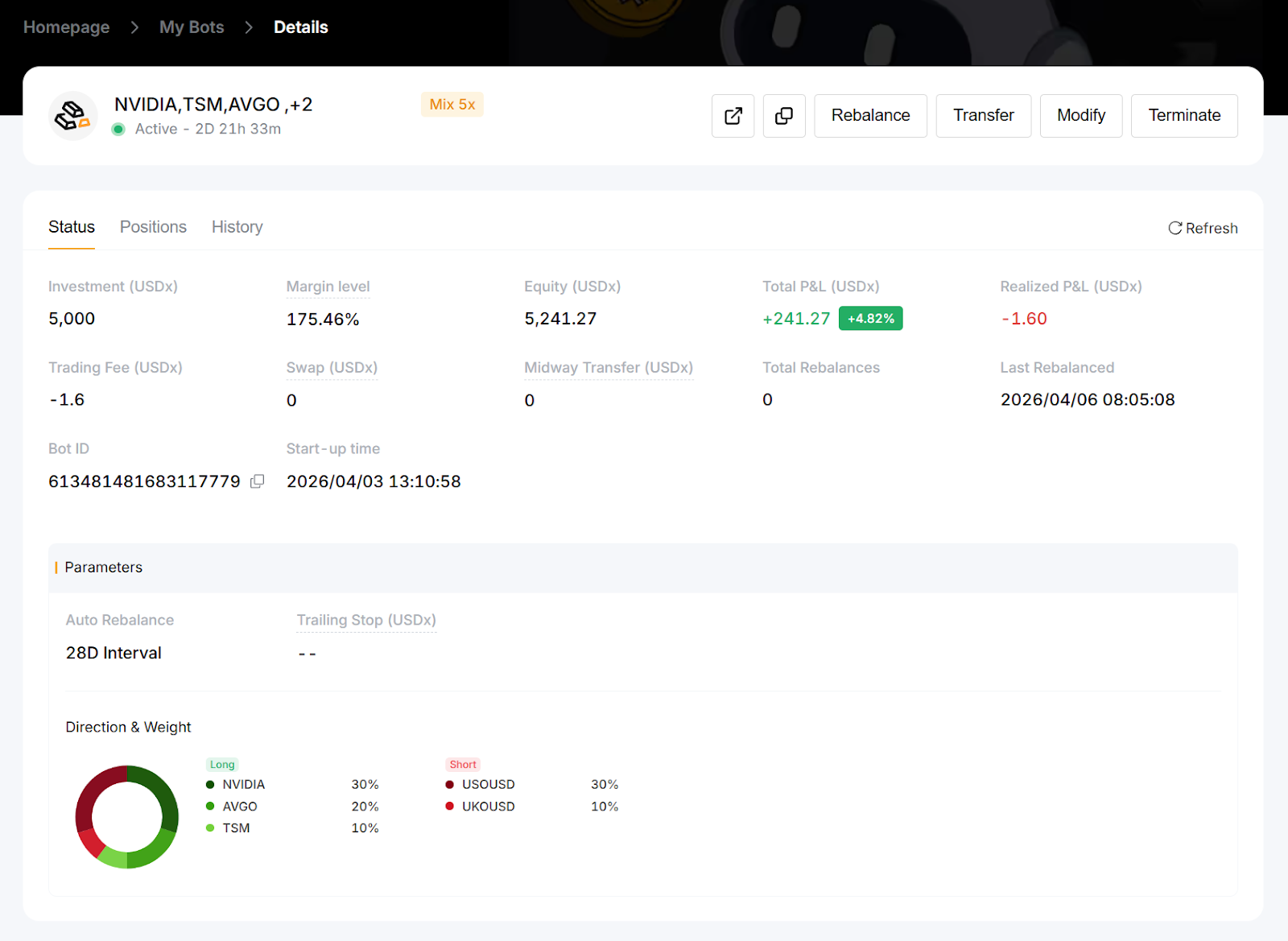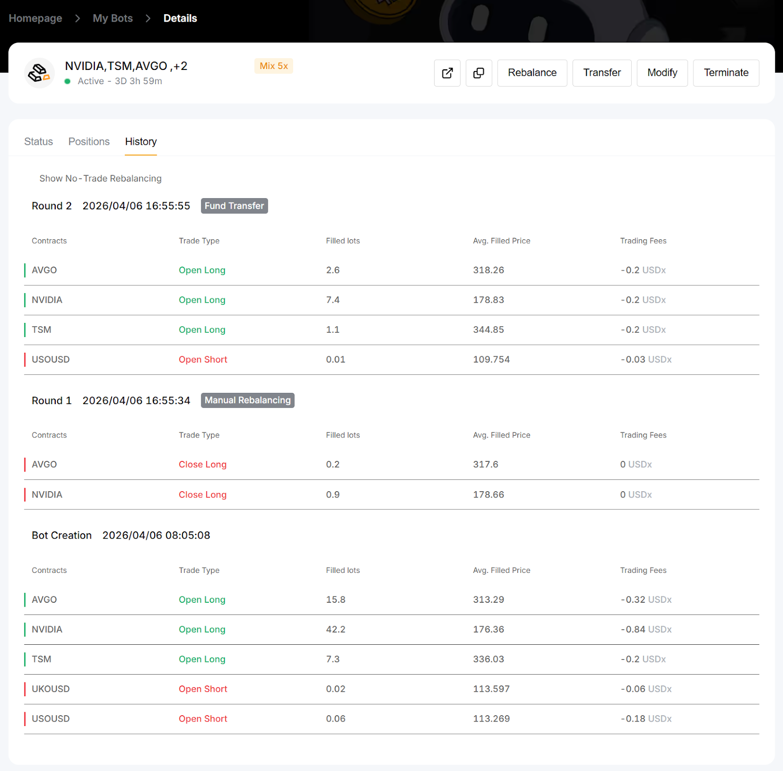 Midway Transfer (USDx) | The total amount you've transferred to the bot so far. Note: If any contract in the bot is suspended due to market closure, added funds will not trigger rebalancing and will be used as margin only. |