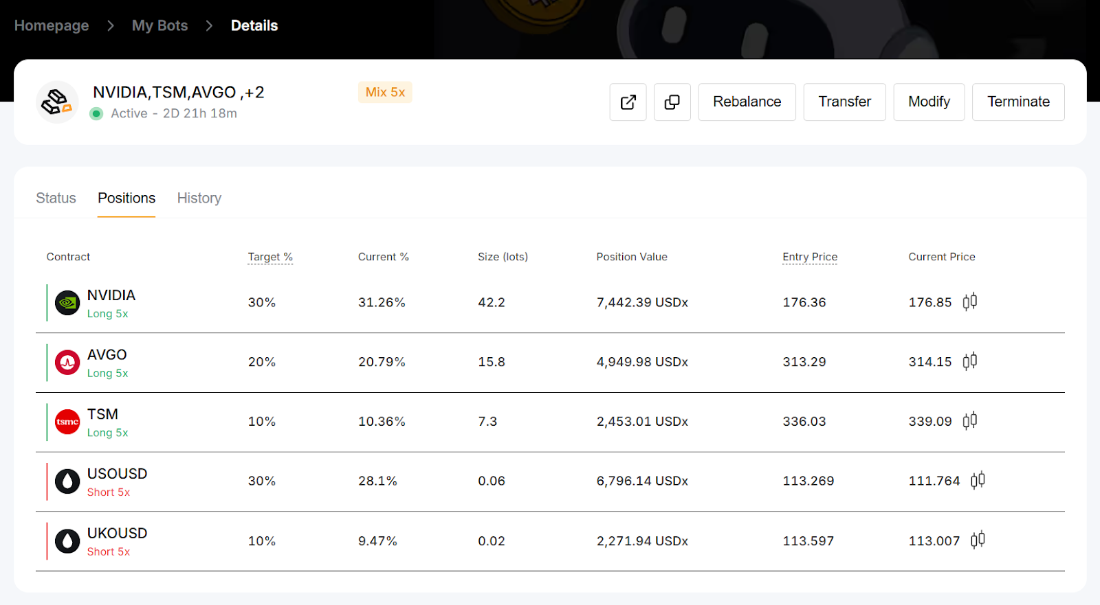 To Be Allocated | Shows the percentage of your portfolio that has not yet been allocated. To create a TradFi Combo Bot successfully, the total allocation must reach 100%. |
