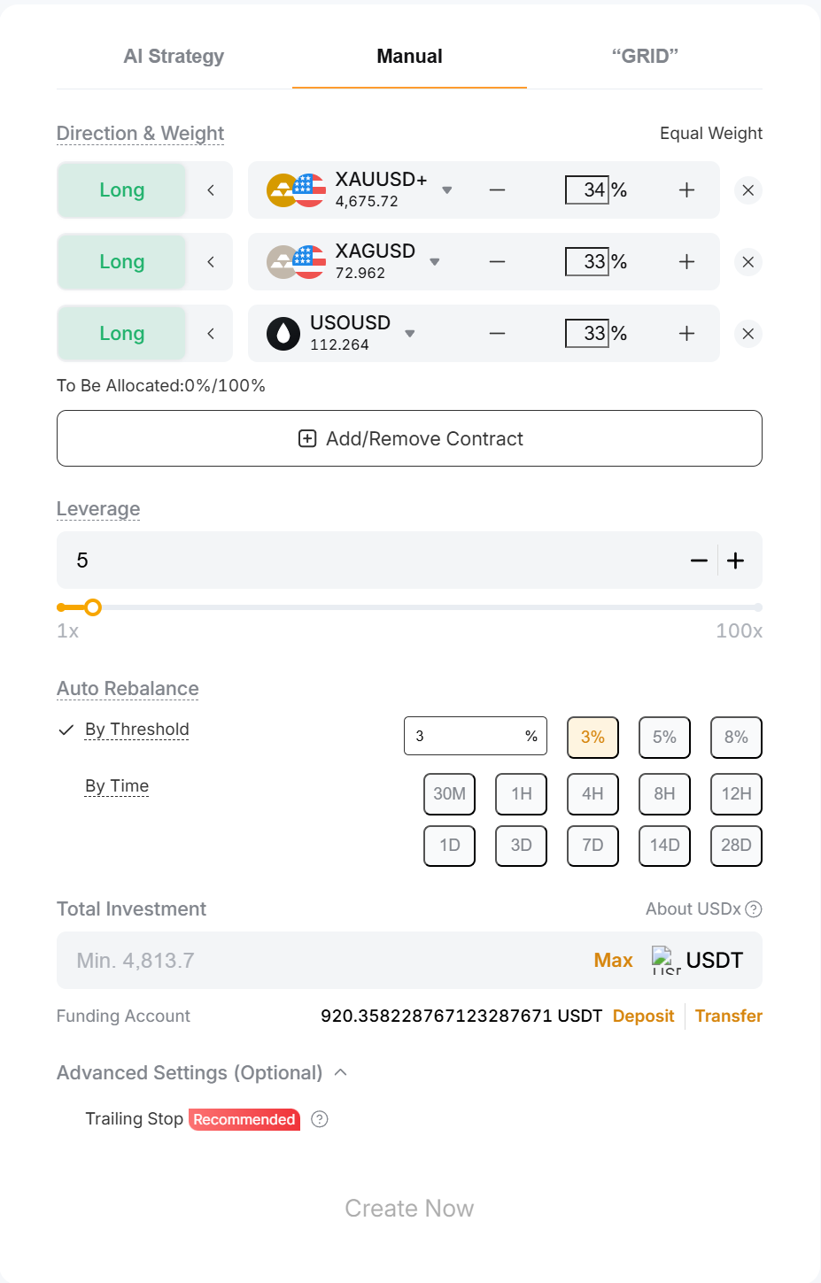 For example, if you set the proportions of XAUT:TSLA:GAS to 5:3:2 and the relative values change to 6:3:1, the system will place orders to restore the original 5:3:2 allocation. |