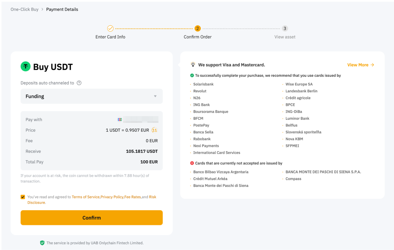 Paso 4: Ingresa y verifica los detalles de la compra y presione Confirmar para procesar tu orden. Toma nota que el precio de referencia se actualizará cada 30 segundos.