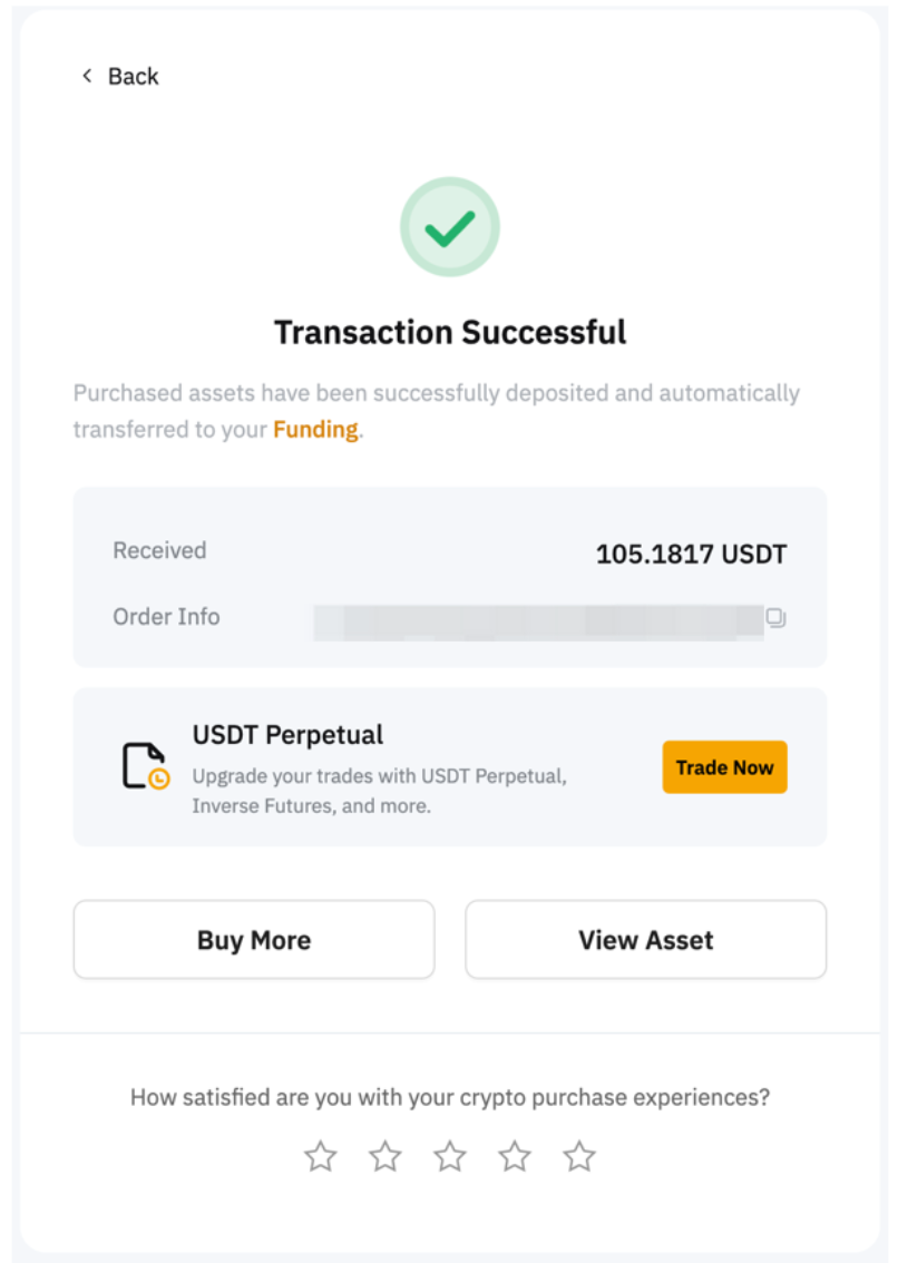 Paso 6: La transacción se ha completado. Las monedas serán acreditadas en tu cuenta inmediatamente cuando la orden haya sido completada.