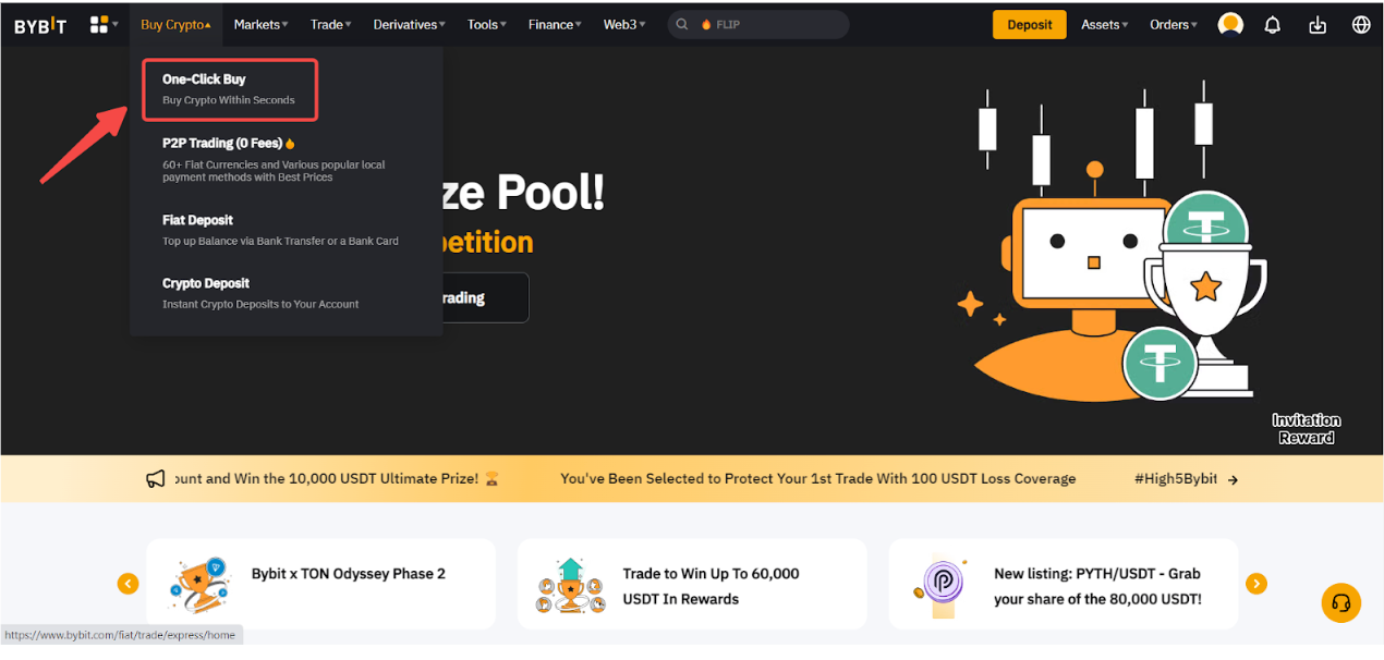 Paso 1: Haz clic en Comprar Cripto → Compra con un clic en la esquina superior izquierda de la barra de navegación para entrar en la página Comprar con un clic.