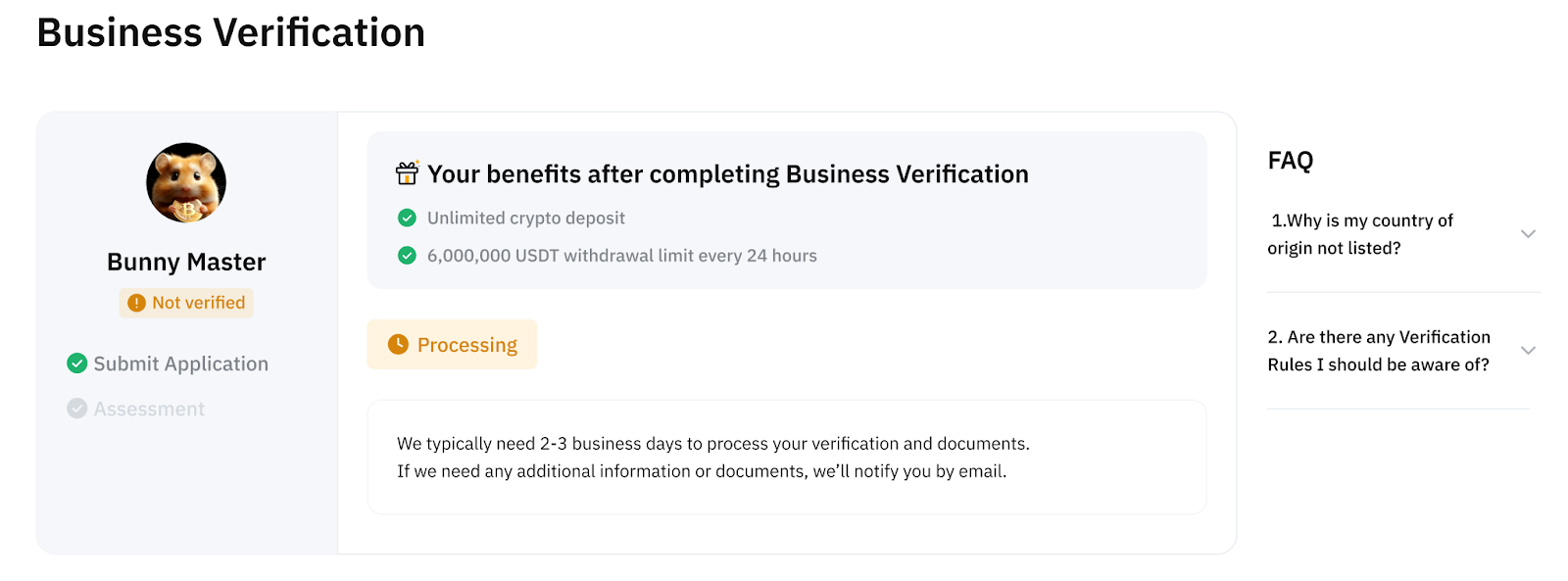 Por lo general, el proceso de verificación KYC empresarial tarda aproximadamente entre 2-3 días laborables. Debido a la complejidad de la verificación de la información, la verificación Business KYC puede llevar más tiempo.
