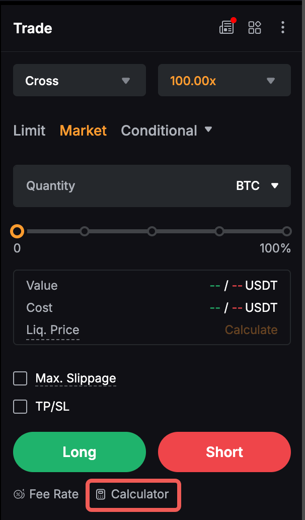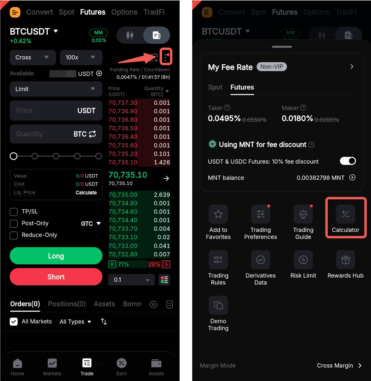 Paso 1: En la web, puede localizar la Calculadora de Bybit en la parte inferior izquierda de la zona de órdenes. Si está utilizando la aplicación, vaya a Trade y pulse el icono de puntos suspensivos en la esquina superior derecha para abrir la página de configuración de trading.