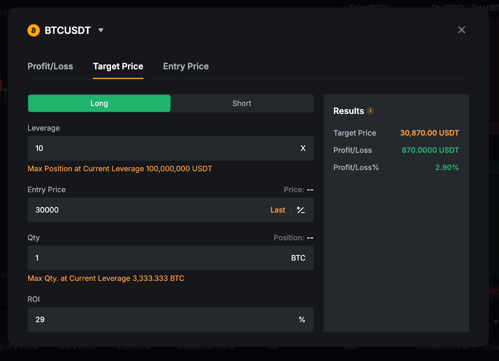 Al introducir el valor anterior, podemos calcular que, para que la posición alcance un ROI del 29 %, el precio objetivo de take profit/exit debe establecerse en torno a 7280 USDT.