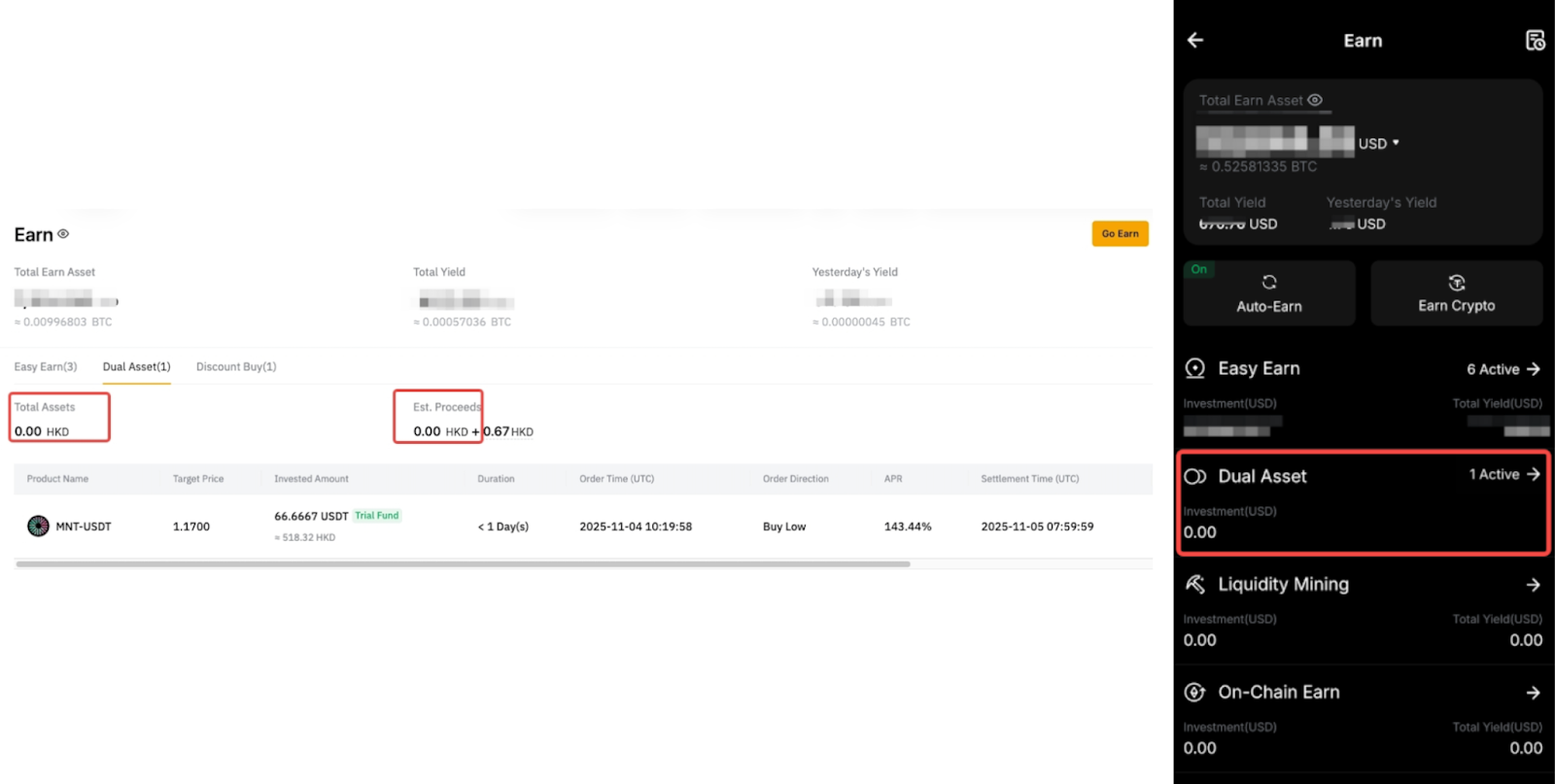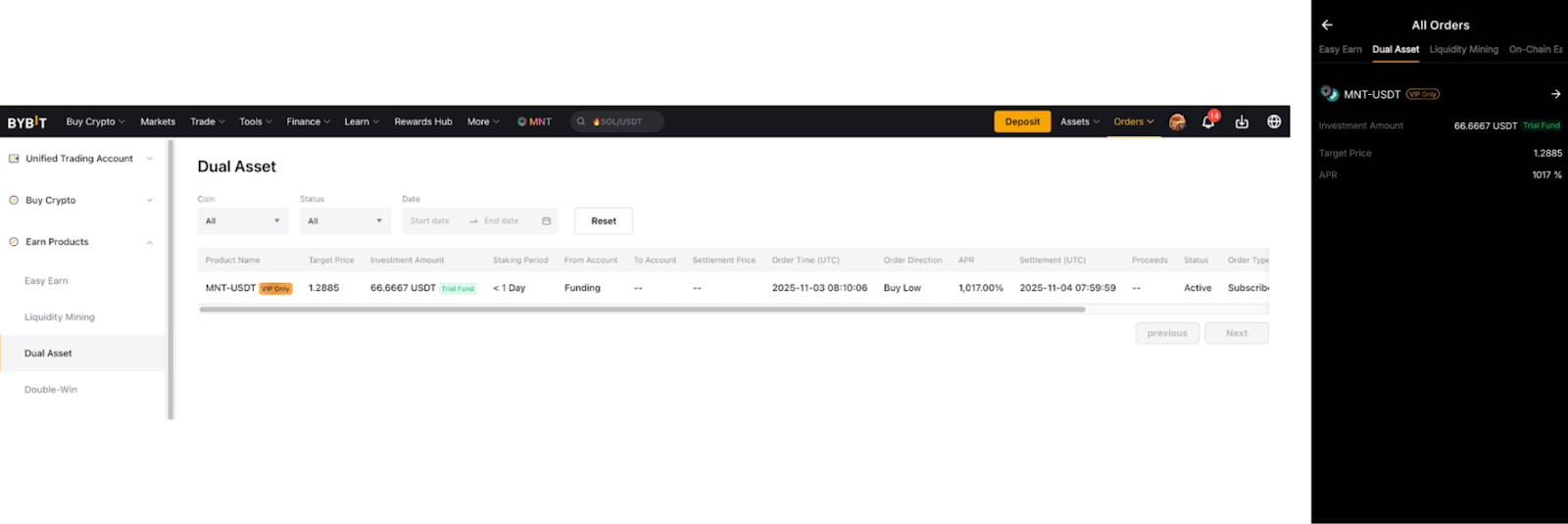 El fondo de prueba Dual Asset le permite experimentar retornos reales de Dual Asset sin incurrir en costos. Sus ganancias están determinadas por el precio de liquidación del producto y el APR. Si bien el rendimiento se agregará a su cuenta, el capital del fondo de prueba no se contará para sus activos totales.