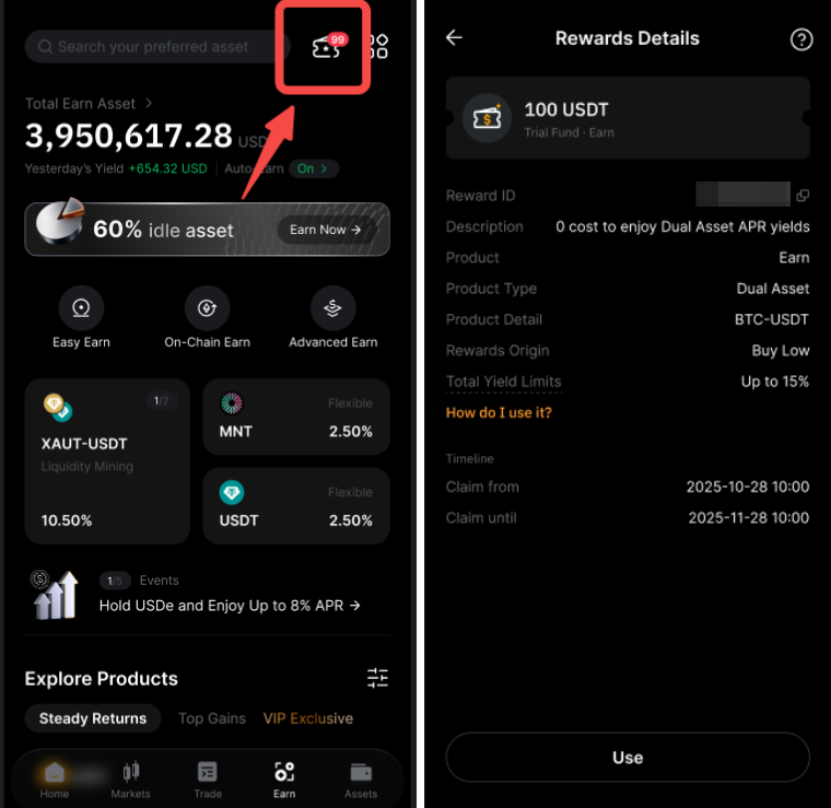 Si es elegible para un Fondo de Prueba para el producto Dual Asset, encontrará las recompensas en la página Bybit Earn en Voucher, ubicada en la esquina superior derecha. Como alternativa, también puede encontrar estas recompensas del fondo de prueba en la página Mis recompensas.
