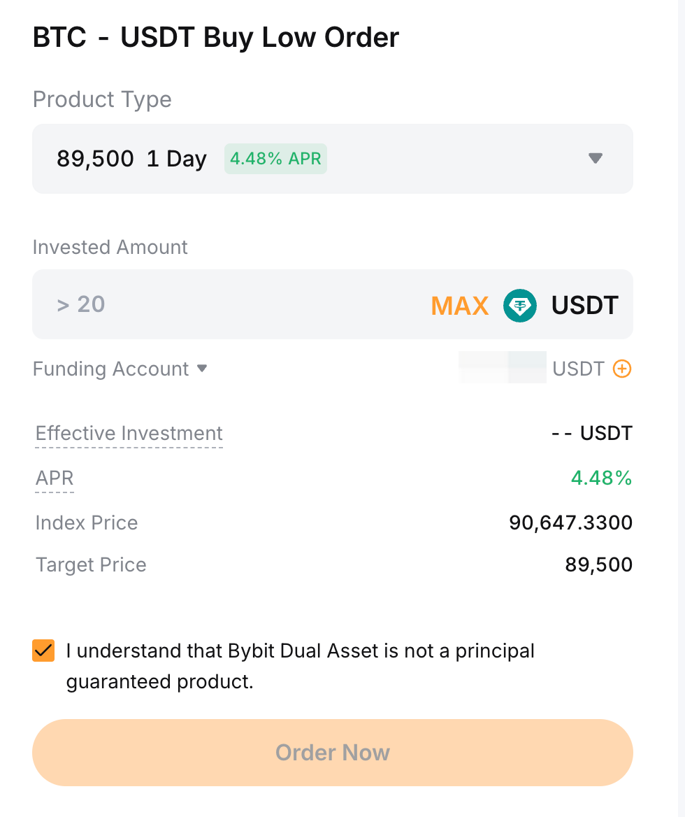 Para el producto Buy Low, puedes suscribirte usando stablecoin (USDT), mientras que para el producto Sell High, puedes suscribirte usando los criptoactivos (como BTC, ETH).