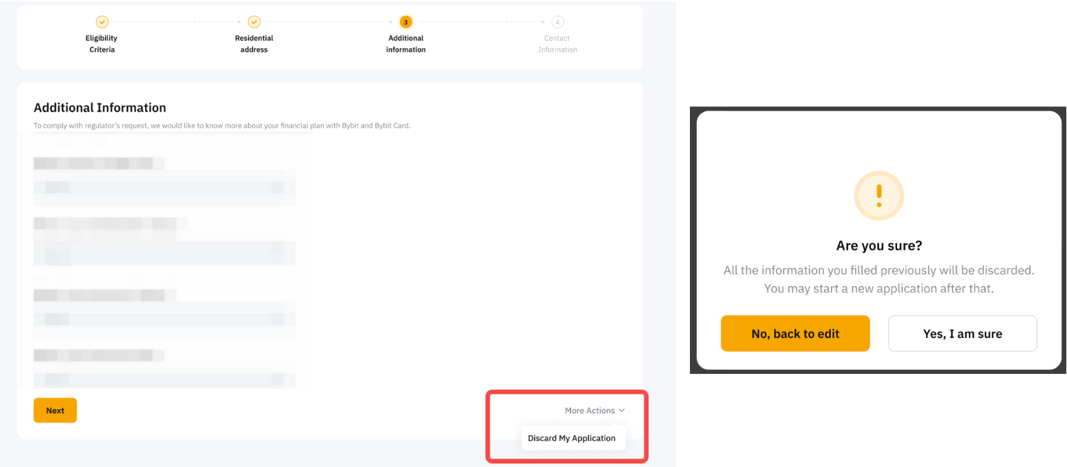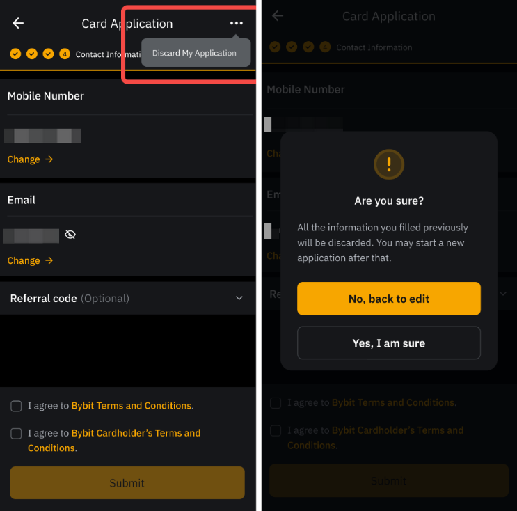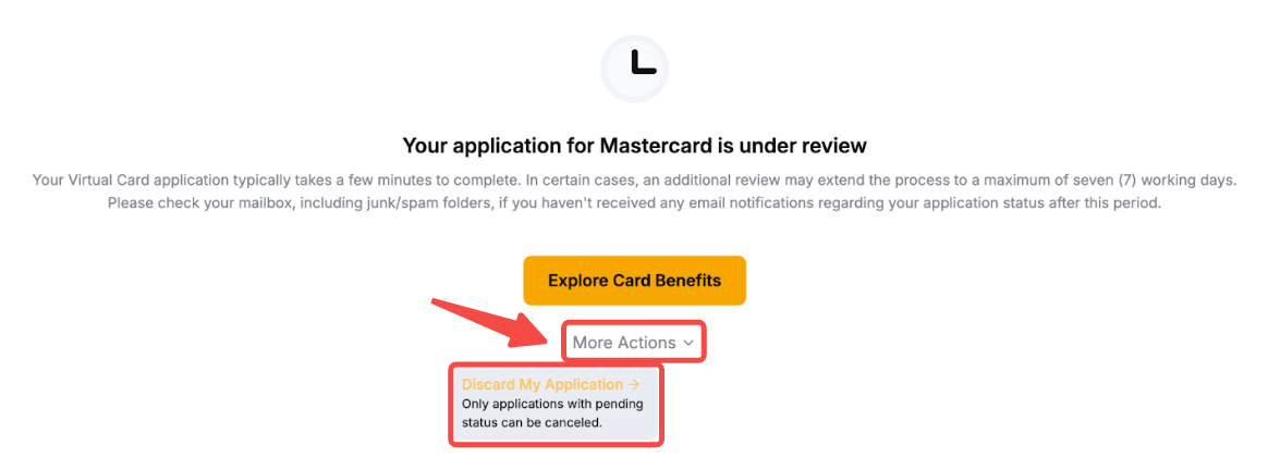 Puede cancelar su solicitud de tarjeta Bybit haciendo clic en Ver mi solicitud → Más acciones y seleccionando Descartar mi solicitud de tarjeta.