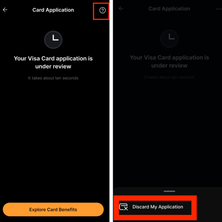 En la aplicación, puede hacer clic en Ver mi aplicación y luego en el botón '?'. Luego, elija Descartar mi solicitud de tarjeta.