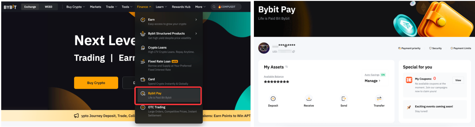 Si estás en el sitio web de Bybit, haz clic en Finanzas y toca Bybit Pay.