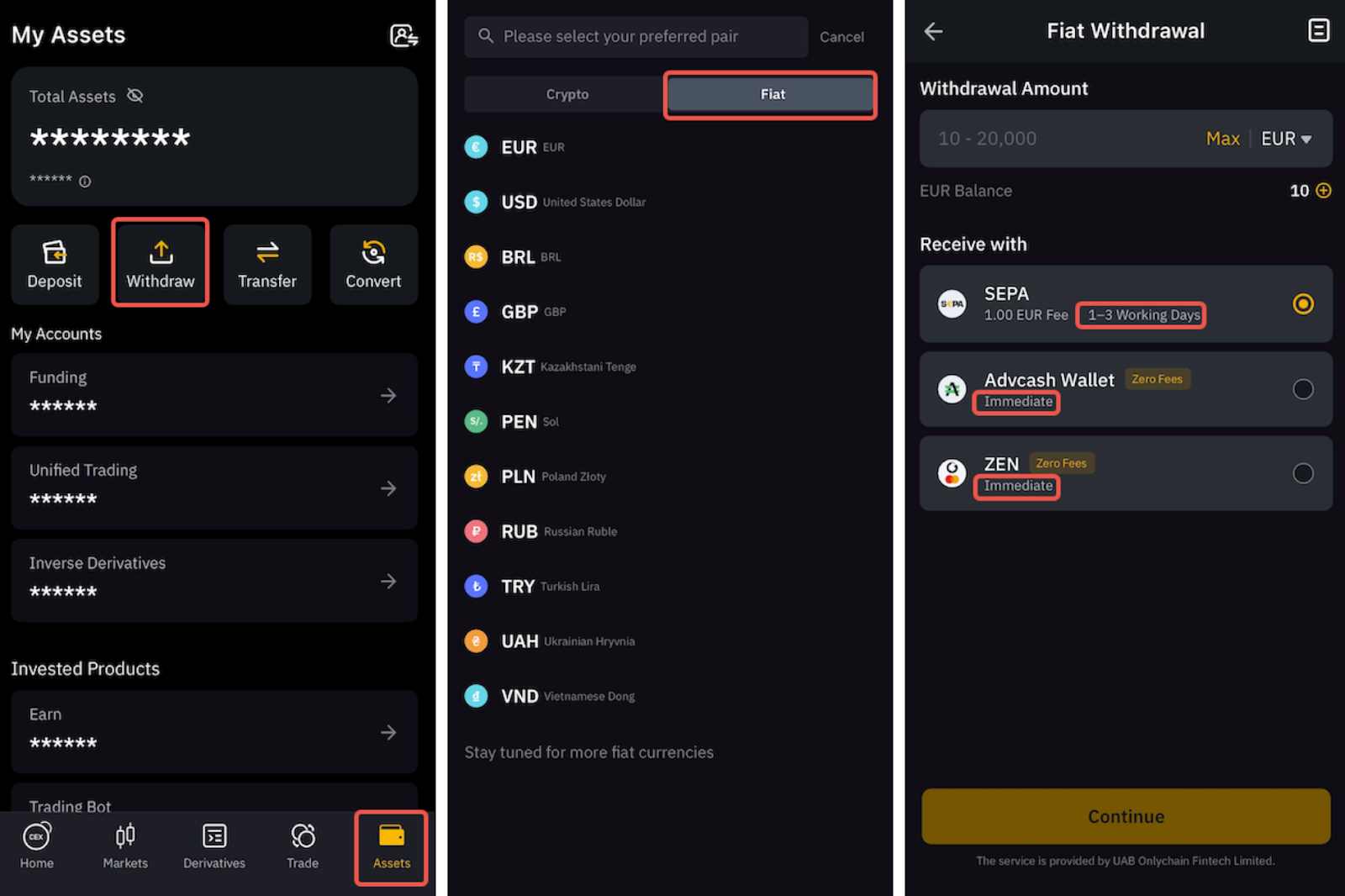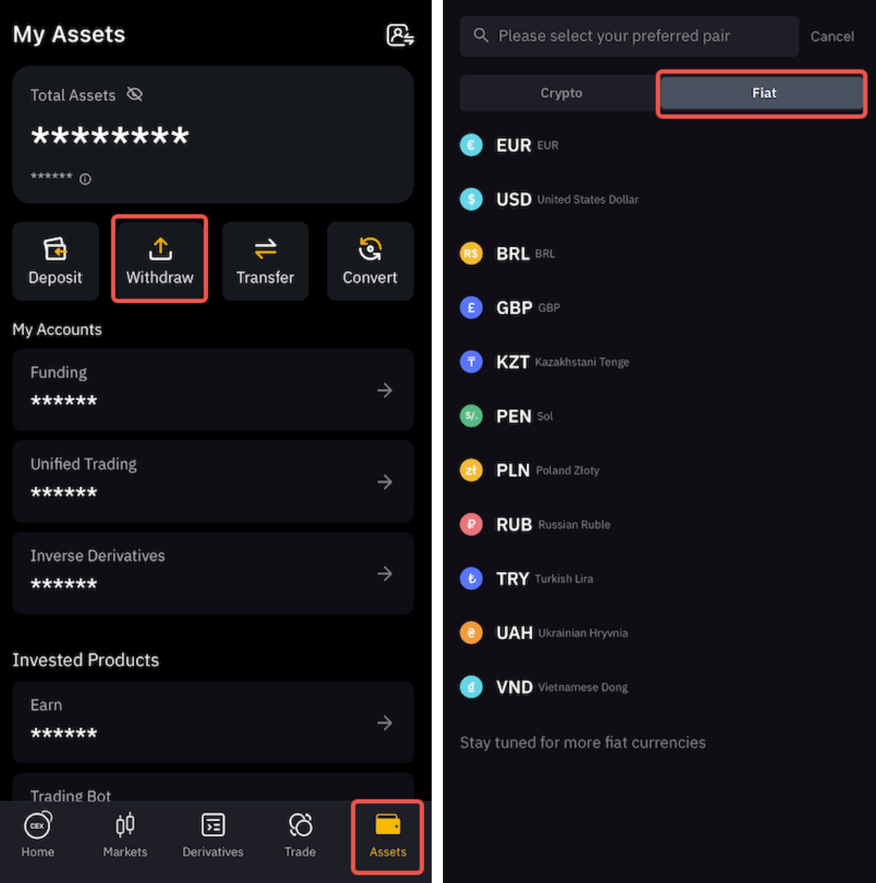 En la aplicación, vaya a la pestaña Activos y pulse sobre Retirar, después vaya a la sección Fiat para acceder a la lista de opciones admitidas.