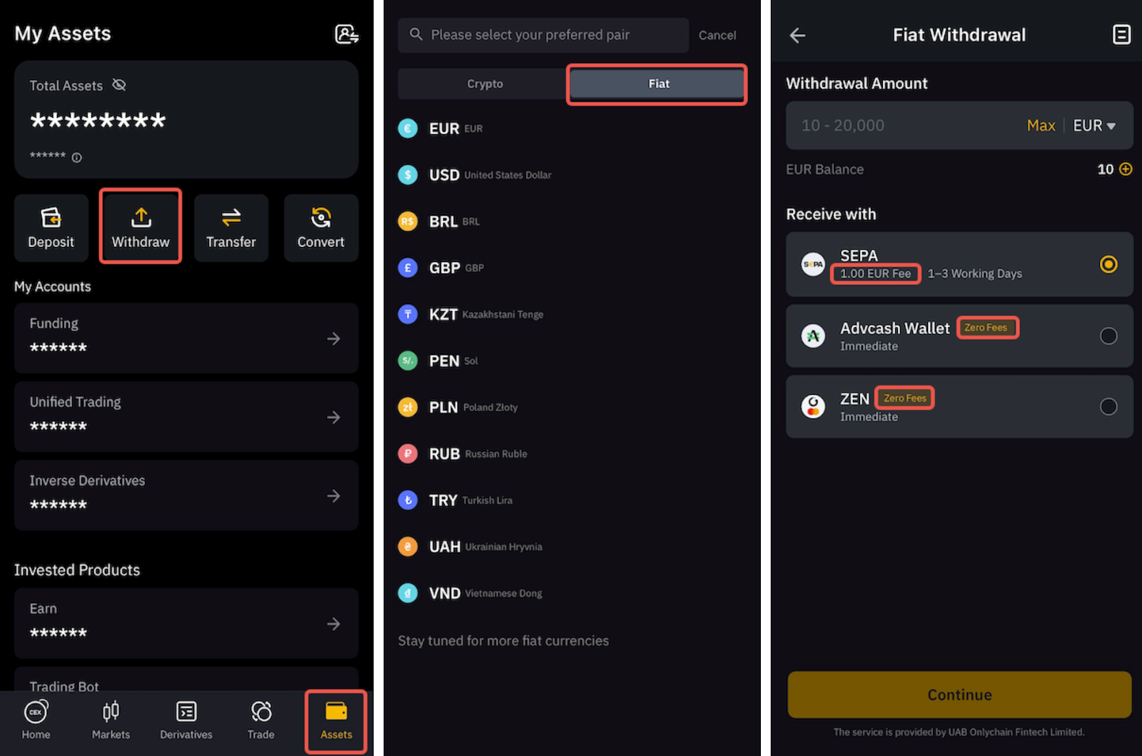 En la aplicación, vaya a la pestaña Activos y pulse Retirar, luego cambie a la sección Fiat. A continuación, pulse sobre la divisa Fiat y consulte las comisiones asociadas a cada método de pago.