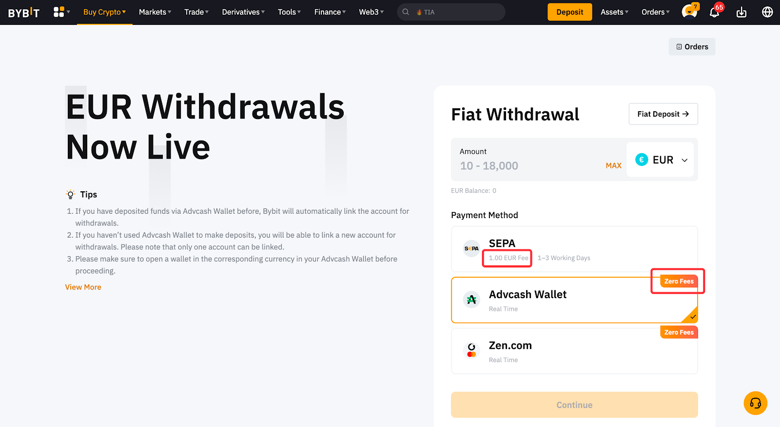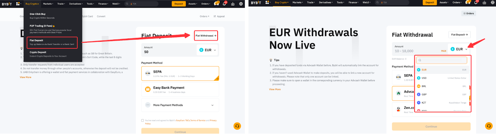Sólo una cantidad seleccionada de monedas fiat están disponibles para retiros en Bybit. Podrá ver las monedas fiat admitidas para el retiro fiat yendo a la página de su cuenta de financiación y comprobando las opciones de retiros fiat.
