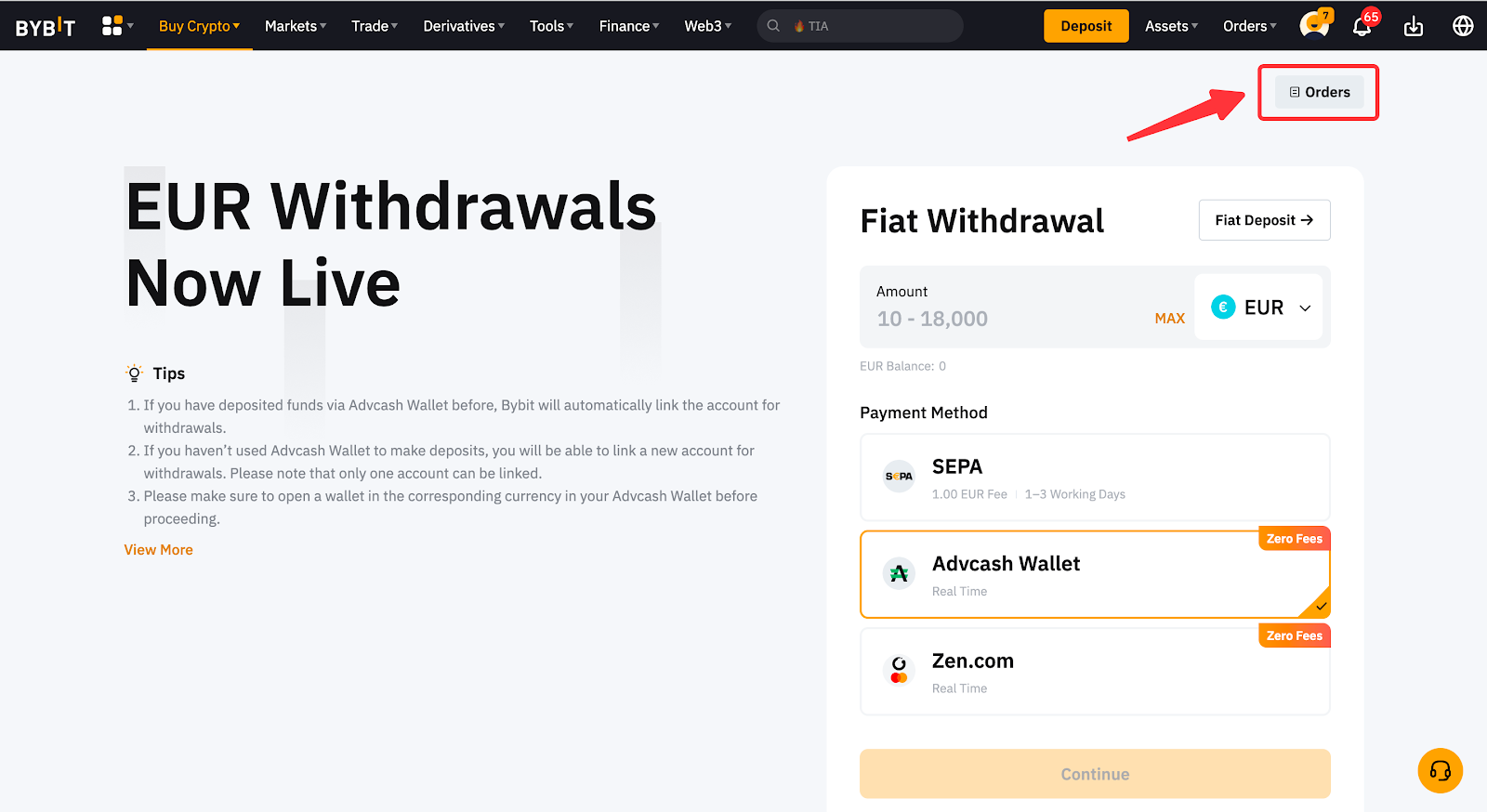 Para ver tu historial de retiro de divisa fiat, haz clic en Órdenes en la esquina superior derecha para obtener más información dentro de la página de Retiros Fiat.