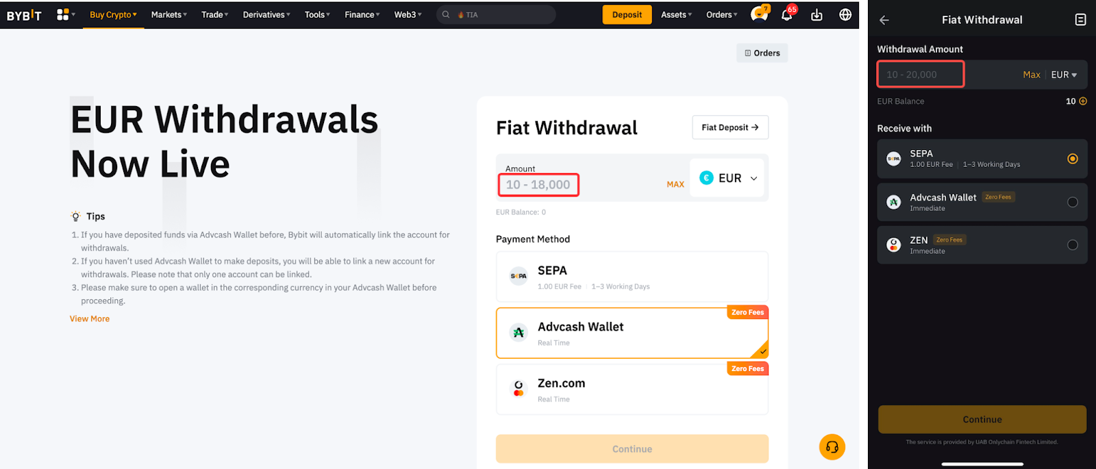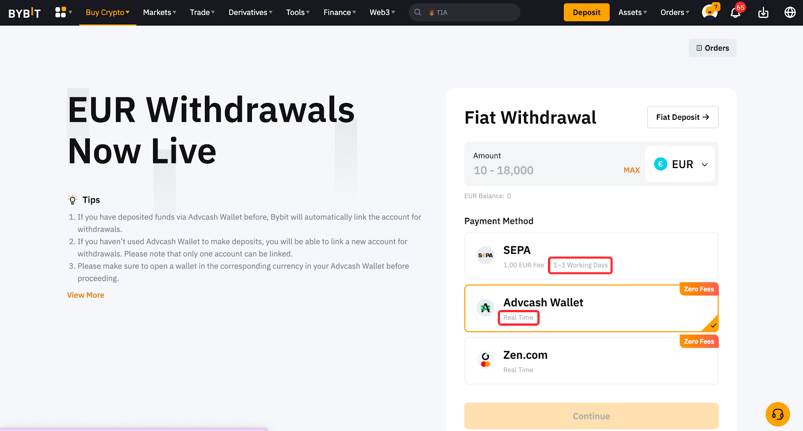 El tiempo de procesamiento puede variar en función de la moneda fiat y del método de pago seleccionado. Puede encontrar el tiempo de procesamiento estimado para cada divisa yendo a la página de retiro de fondos fiduciarios y seleccionando la divisa de su elección. Para más información, lea también los consejos que aparecen junto a la ventana de pedido.