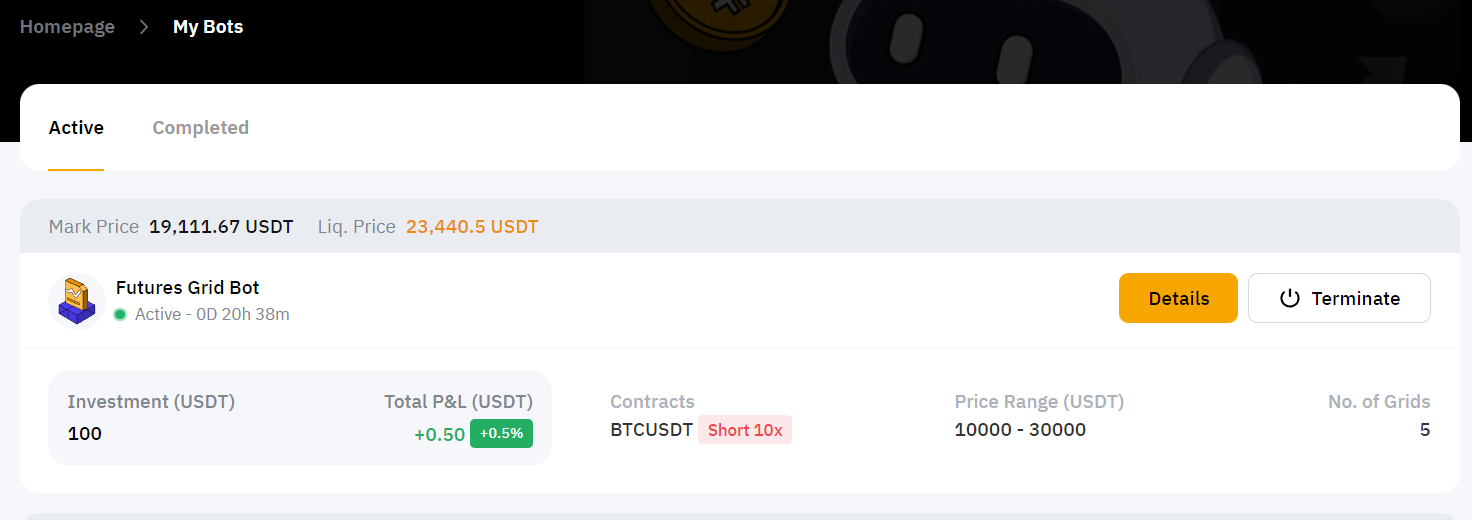 Por favor, accede a Mis Bots para ver todos los traders activos y completos. Haz clic en Detalles para ver los detalles del trade, incluyendo la(s) ganancia(s), el total APR y el rango de precios.
