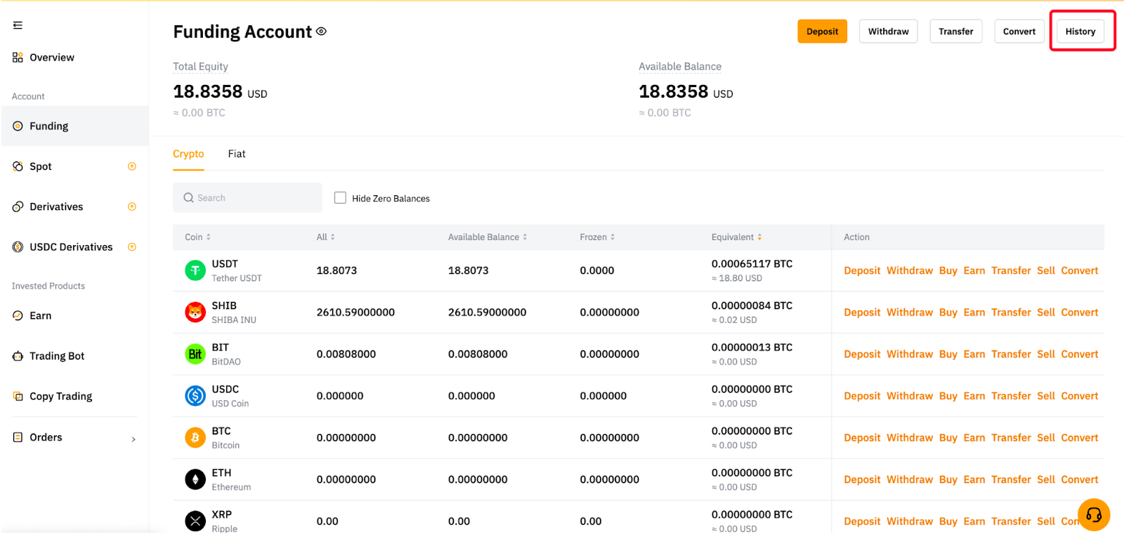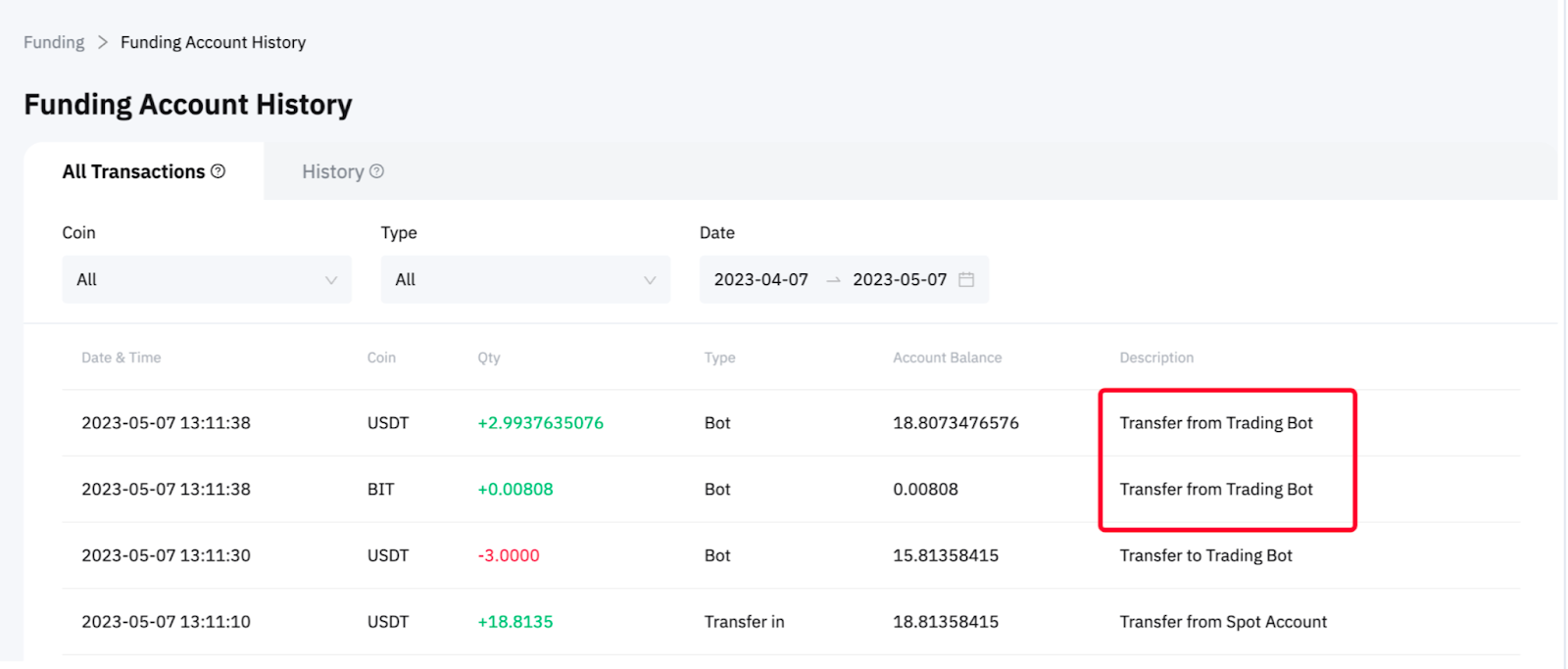 Haga clic en Activos → Cuenta de financiación → Historial → Seleccione Bot en la pestaña Tipo de la página Todas las transacciones.